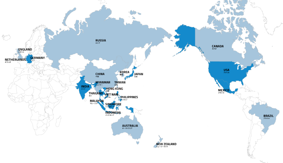 日本、アメリカ、インド、英国、ドイツ、メキシコ、シンガポール、香港、マレーシア、タイ、ベトナム、フィリピン、インドネシア