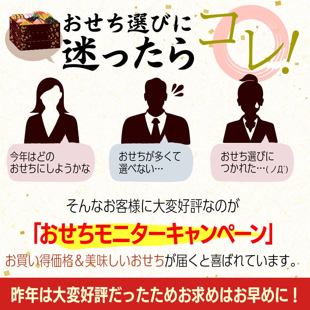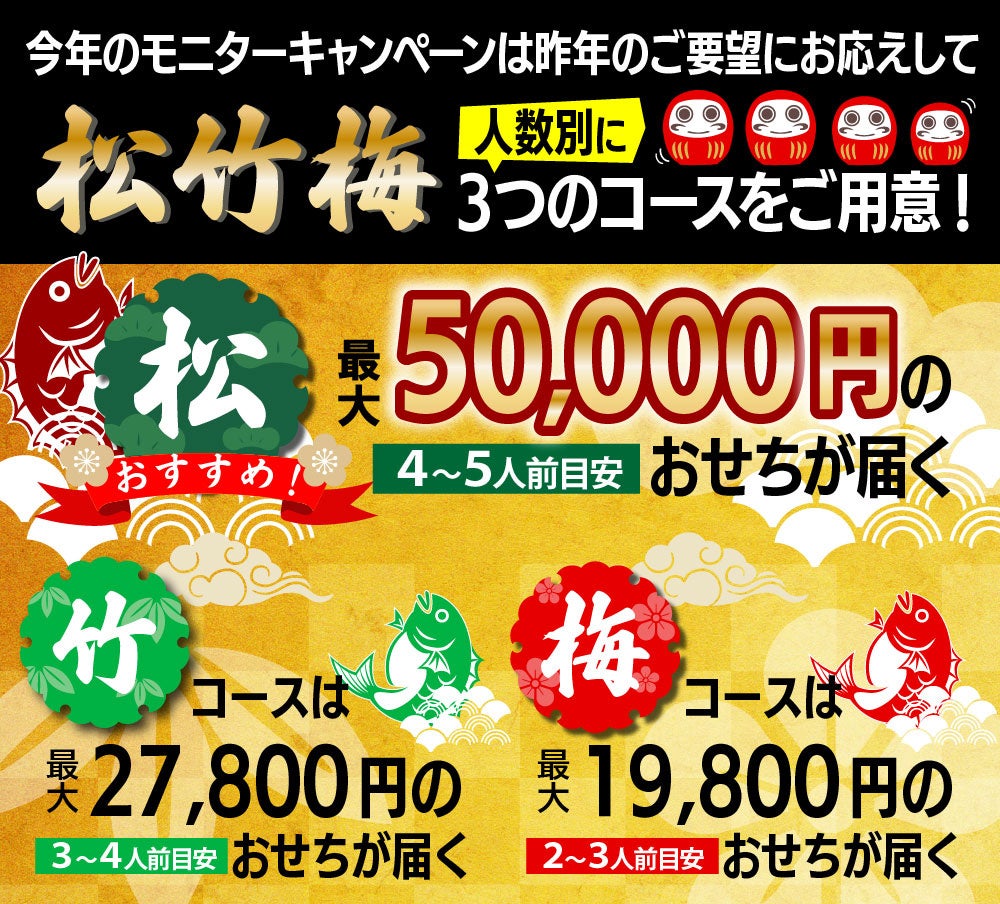 今年のおせち福袋 モニターキャンペーンはご要望にお応えして、人数別に3つのコースをご用意しました