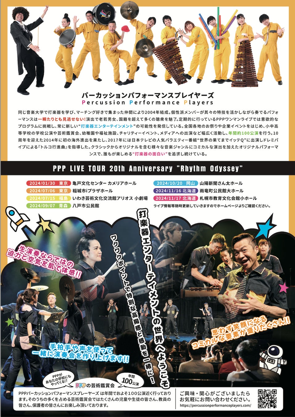 PPPは、全国の小学校を中心に芸術鑑賞会を開催し、音楽を通じて豊かな体験を提供してきました。20周年を迎える今回のツアーでは、これまでの活動を振り返りつつ、新たなステージをお届けします。音楽を通じた共感と学びの場を提供し、社会全体に音楽文化の普及と豊かさをもたらすことを目指しています。