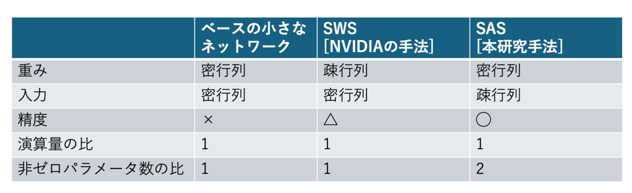 【図1】 2:1のスパースパターンを用いて演算量を保ったまま層ごとのパラメータ数を増やす手法の比較