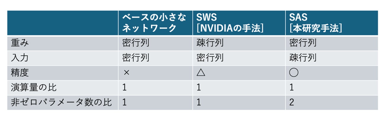 このように、本研究の提案するSASは演算量を変えずにたくさんのパラメータをもった幅の広いニューラルネットワークを実現します。そのため、同じ演算量のもとで、直接重みをスパースにする従来のSWSより高い表現力・精度を保持できます。さらに入力のスパース性を上げていくことで演算量を変えずに精度が向上していくことも確認できました。また、SASによる内積がSparse Tensor Coreで動作することも検証しました。