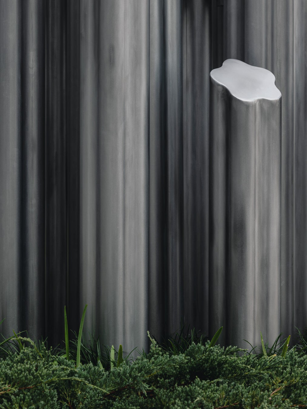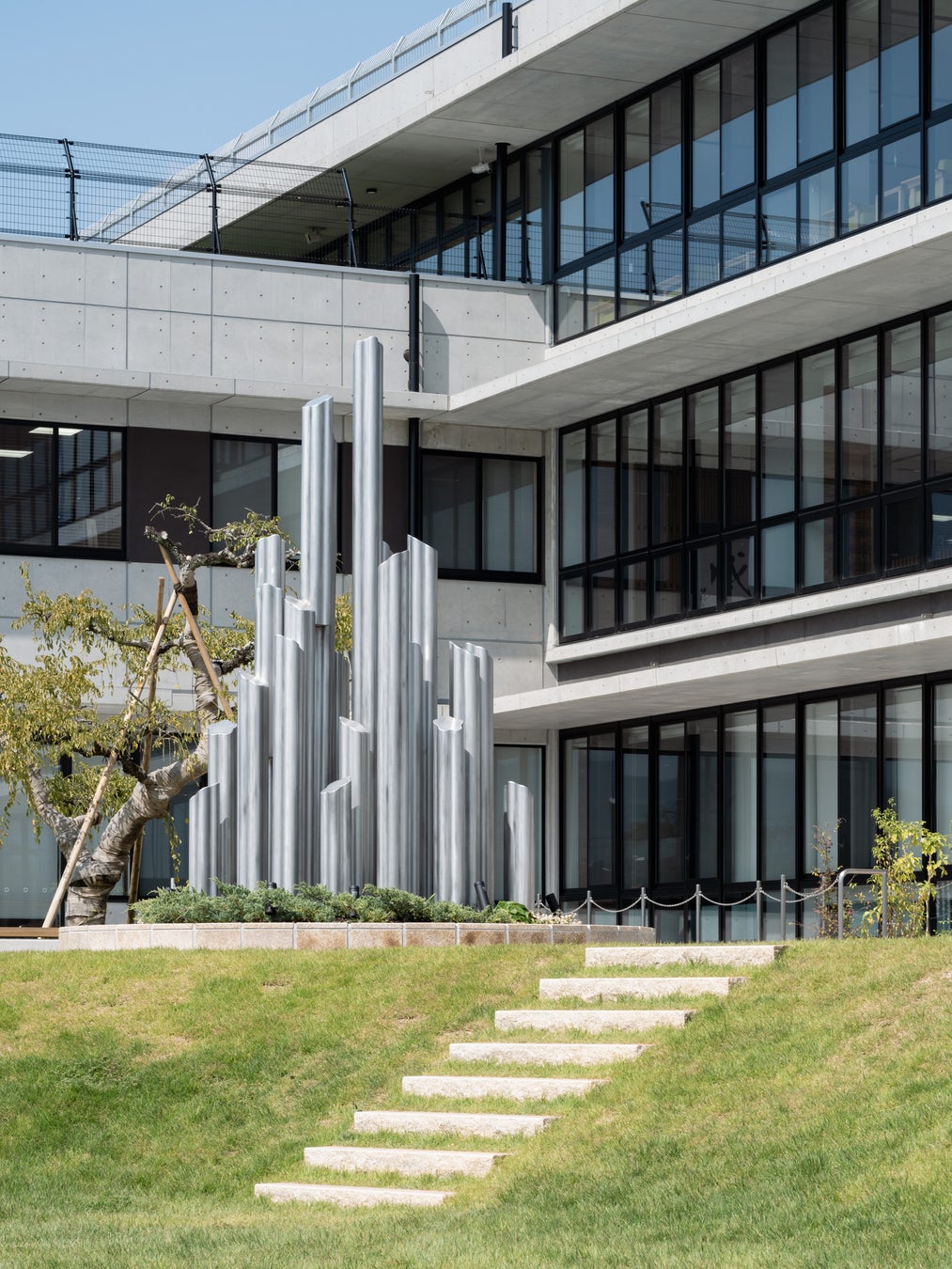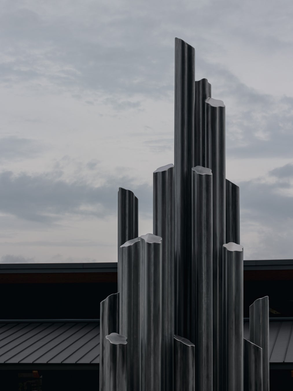 アルミの型押しにより成形された柱を大小様々な形状にし、23本を組み合わせることで、手を合わせるような形状として表現しました。23本としたのは、隣接する復興まちづくりセンター「にじいろ」が発災した2016年にちなんだ名称であることをヒントに、公園がオープンする2023年の23に合わせました。
