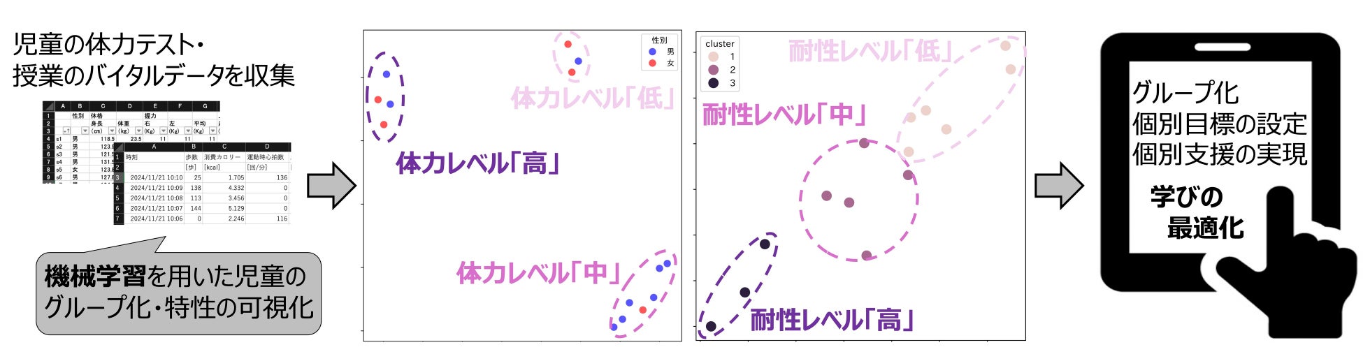 これにより、児童を統計学に基づき分類し、分類された児童集団を特徴づける因子を特定し、児童の特性に基づく授業目標の設定を通した「学びの最適化」を実現できるかを検証しました。