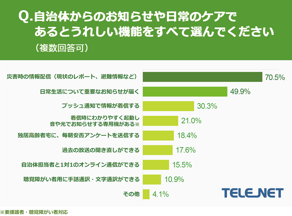 70.5%の方が「災害時の情報配信(現状のレポート、避難情報など)」が欲しいと回答しています。
