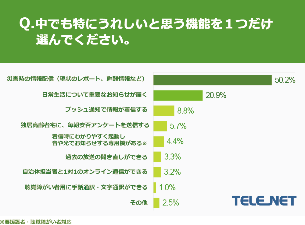 50.2%と半数以上の方が「災害時の情報配信(現状のレポート、避難情報など)」と回答しています。