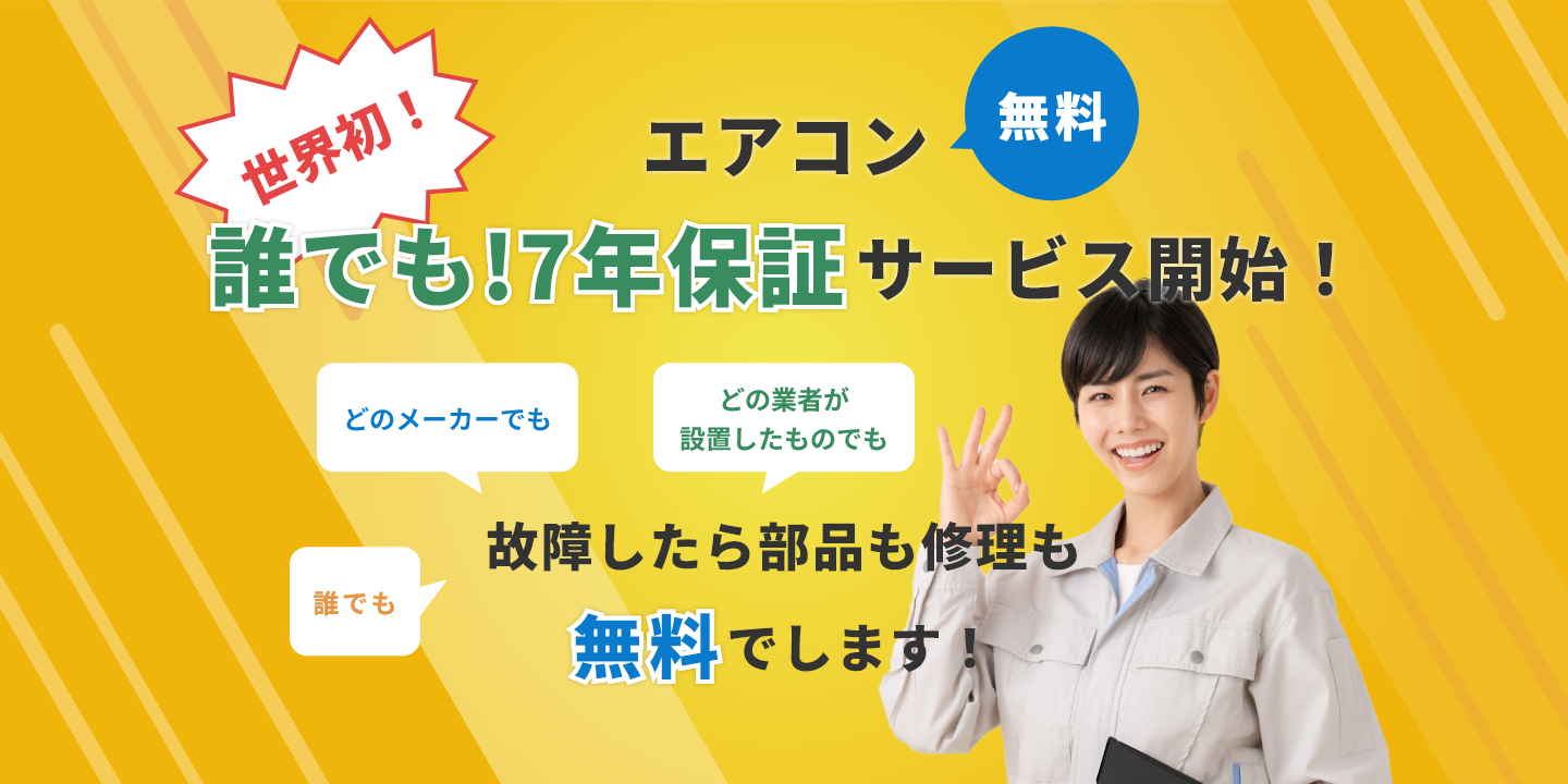 「誰でも!7年保証」とは、エアコン解決.comが提供する無条件の7年間保証サービスのことです。どの業者様が設置したエアコンであっても、どのメーカーであっても、製造年月から7年間の保証を受けることができます。※1