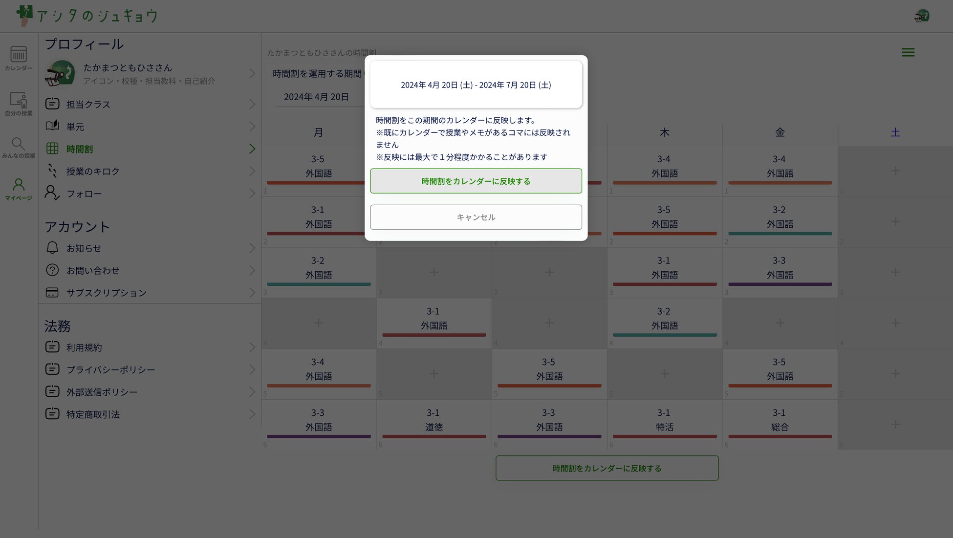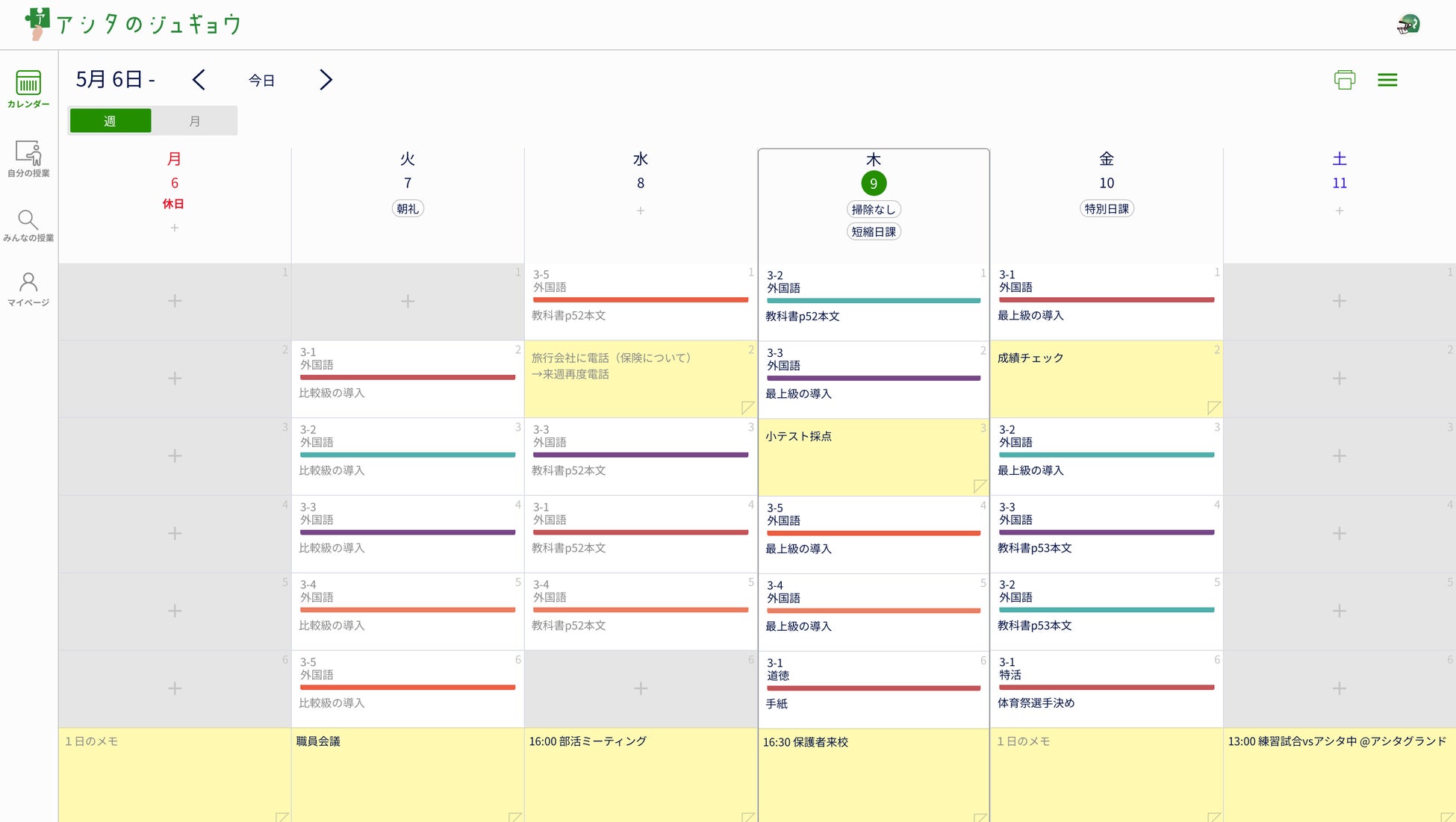 そこで「アシタのジュギョウ」では作成した授業をコマに割り当てられるカレンダーを採用しています。