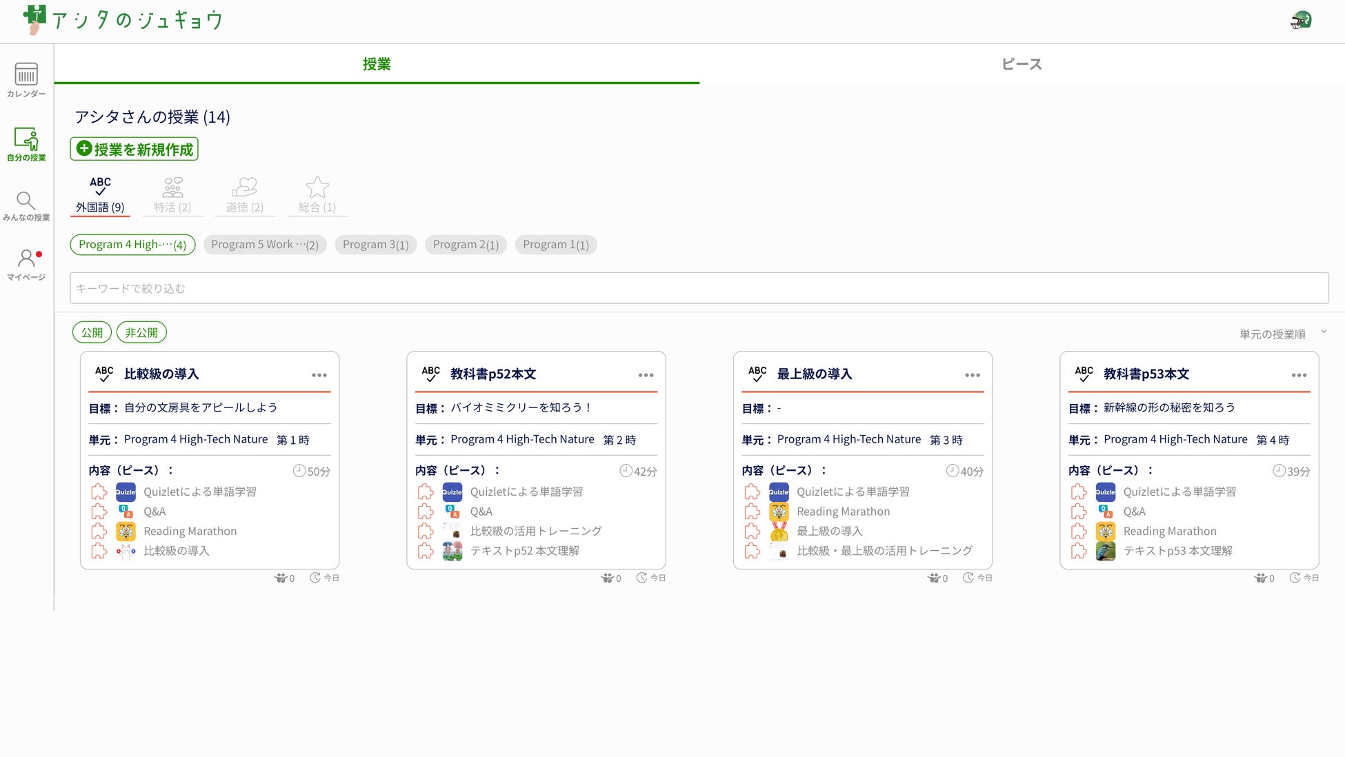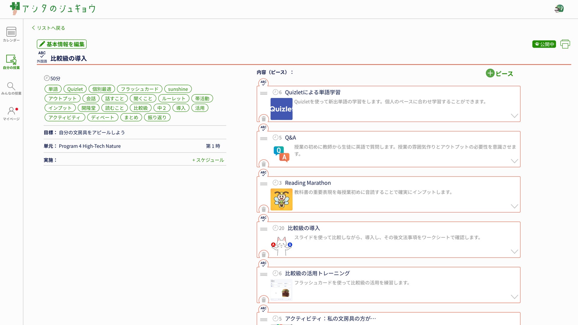 そこで普段準備している授業をそのまま誰もが利用できる形で共有できることが必要だと考え、「アシタのジュギョウ」では授業作成、管理、共有がシームレスにできるようにしました。教科やキーワードで授業を検索し、気になった授業があればそれを自分のリストに入れ、そのまま編集することができます。
