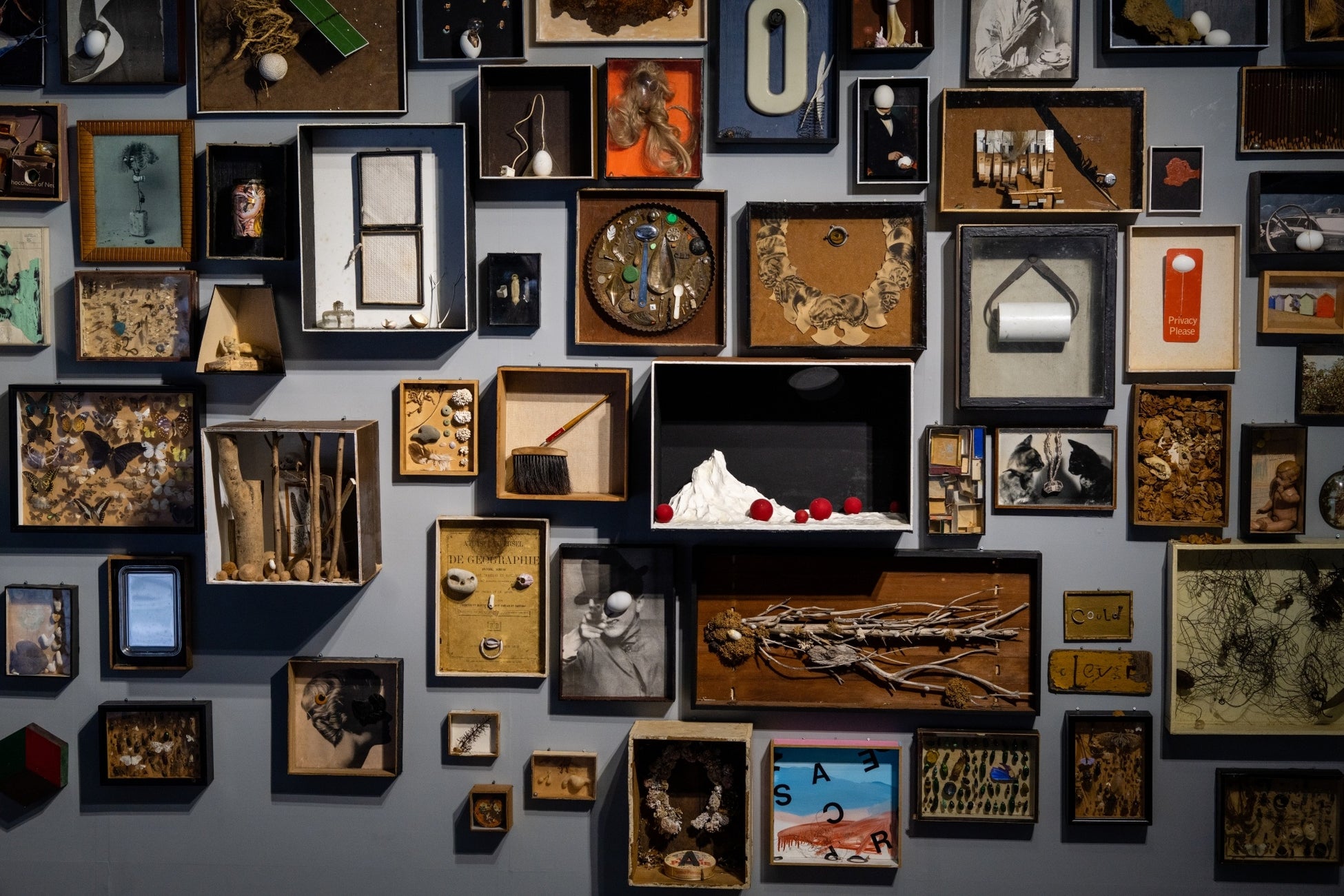 プライベートで加茂が作り続けていた立体作品約200点をご紹介します。木箱の中に、昆虫や植物、卵の殻、雑貨といった身近なものを配置したこれらの作品には、加茂の美意識やシュルレアリスム的な表現への傾倒が感じられます。同時に、優れた造形を瞬時に生み出すセンスと創作技術の高さも見て取れます。