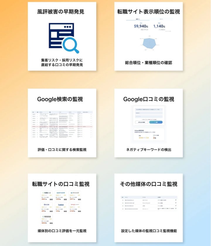 現在、転職会議、オープンワーク、engageなどのキャリア系口コミサイトを監視可能ですが、今後は電話帳ナビ、jpnumber、マンションコミュニティなどの他の口コミサイトにも対応予定です。