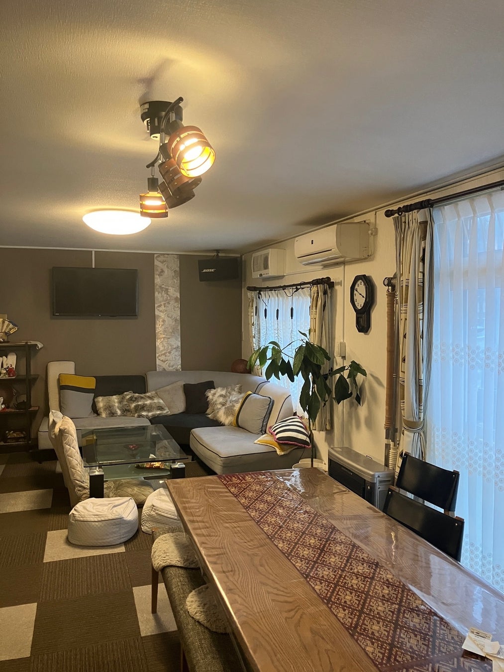 自宅を改装した造りで、外観は一軒家そのもの。玄関を開けて中に入ると右手に居酒屋スペースは広がる。1階の居酒屋スペースにある大きなテーブル席を使って、生地やデザイン等の打ち合わせを行い、2階にあるサロンスペースの大きな鏡の前で採寸・フィッティングを行う。