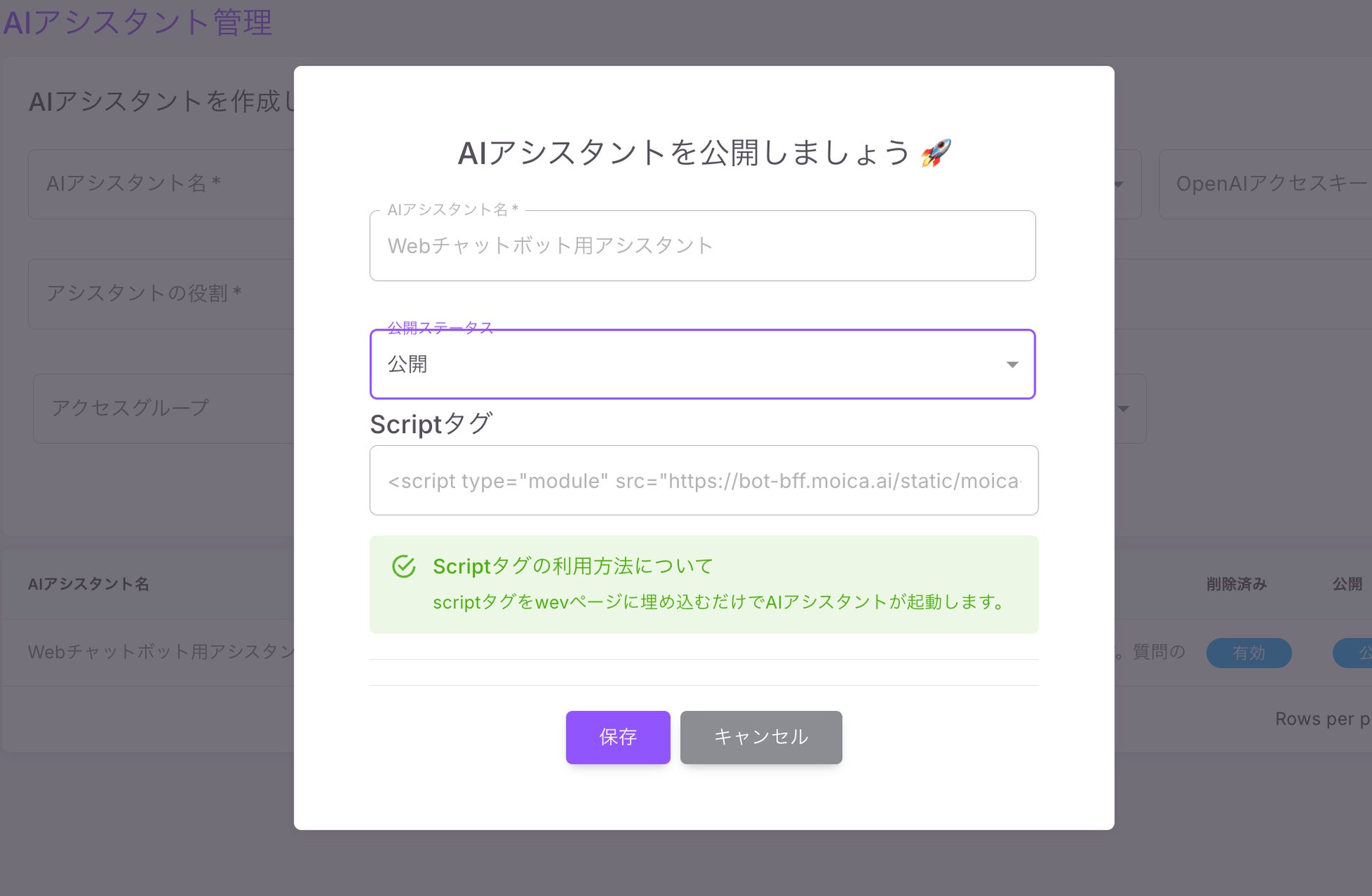チャットボット(MOICA AIBOTではAIアシスタントと呼んでいる)を公開状態に変更し、