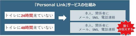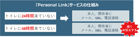 「パーソナルリンク」はトイレに人感センサーを設置します。24時間トイレに来ないことで異常を感知してくれ、関係者の方に連絡が行きます。骨折やぎっくり腰など動くことが困難になった場合の助けにもなります。