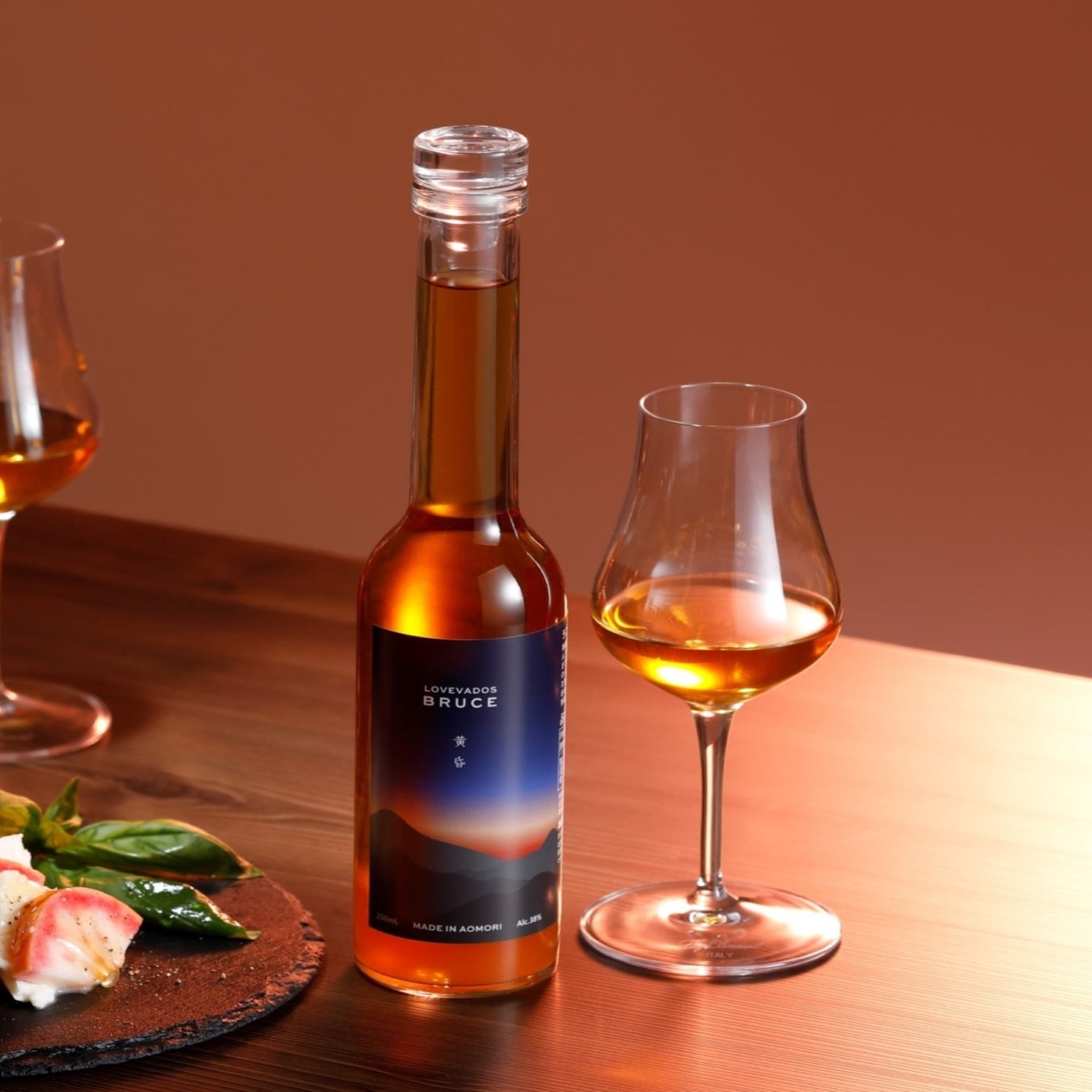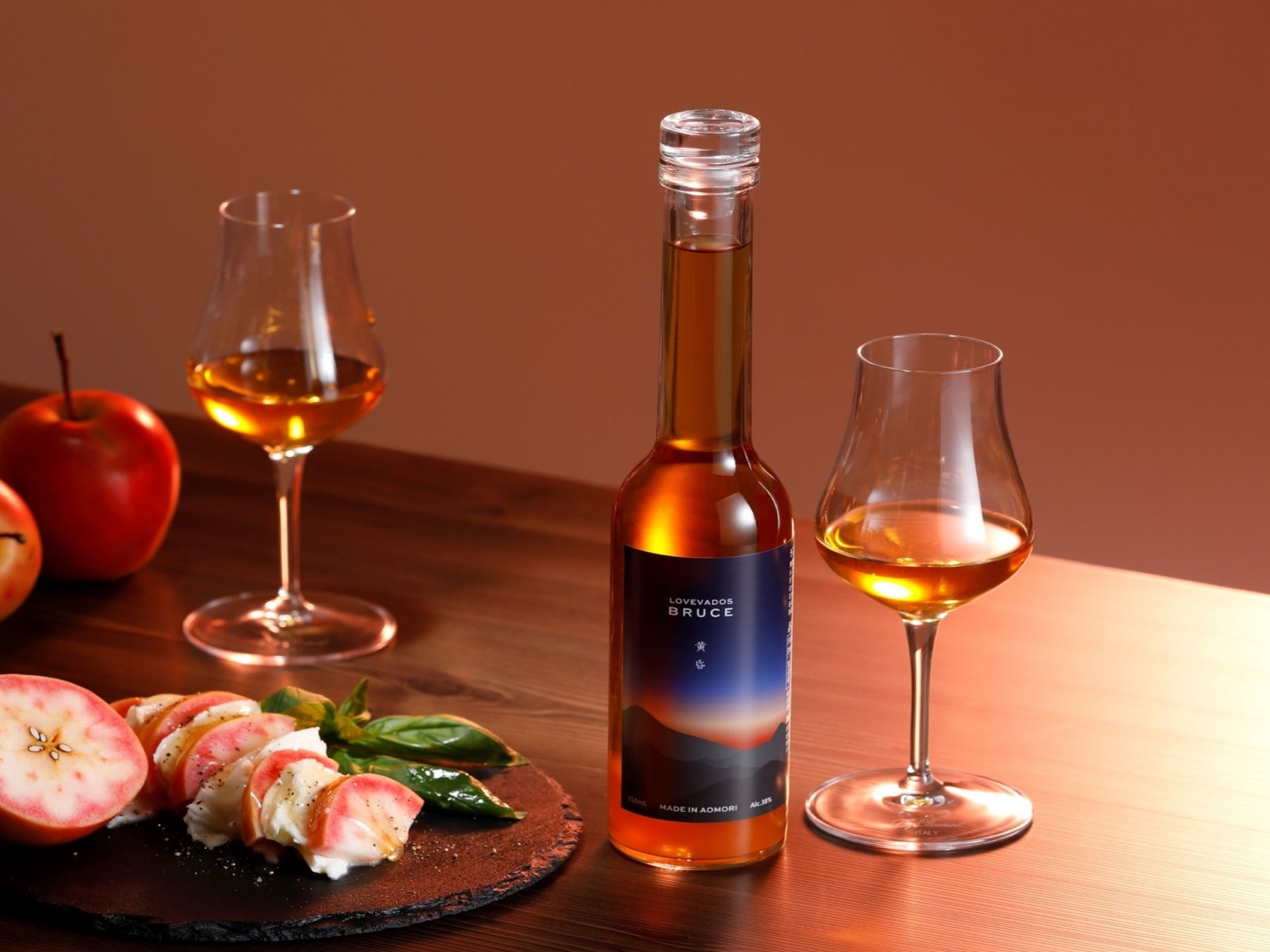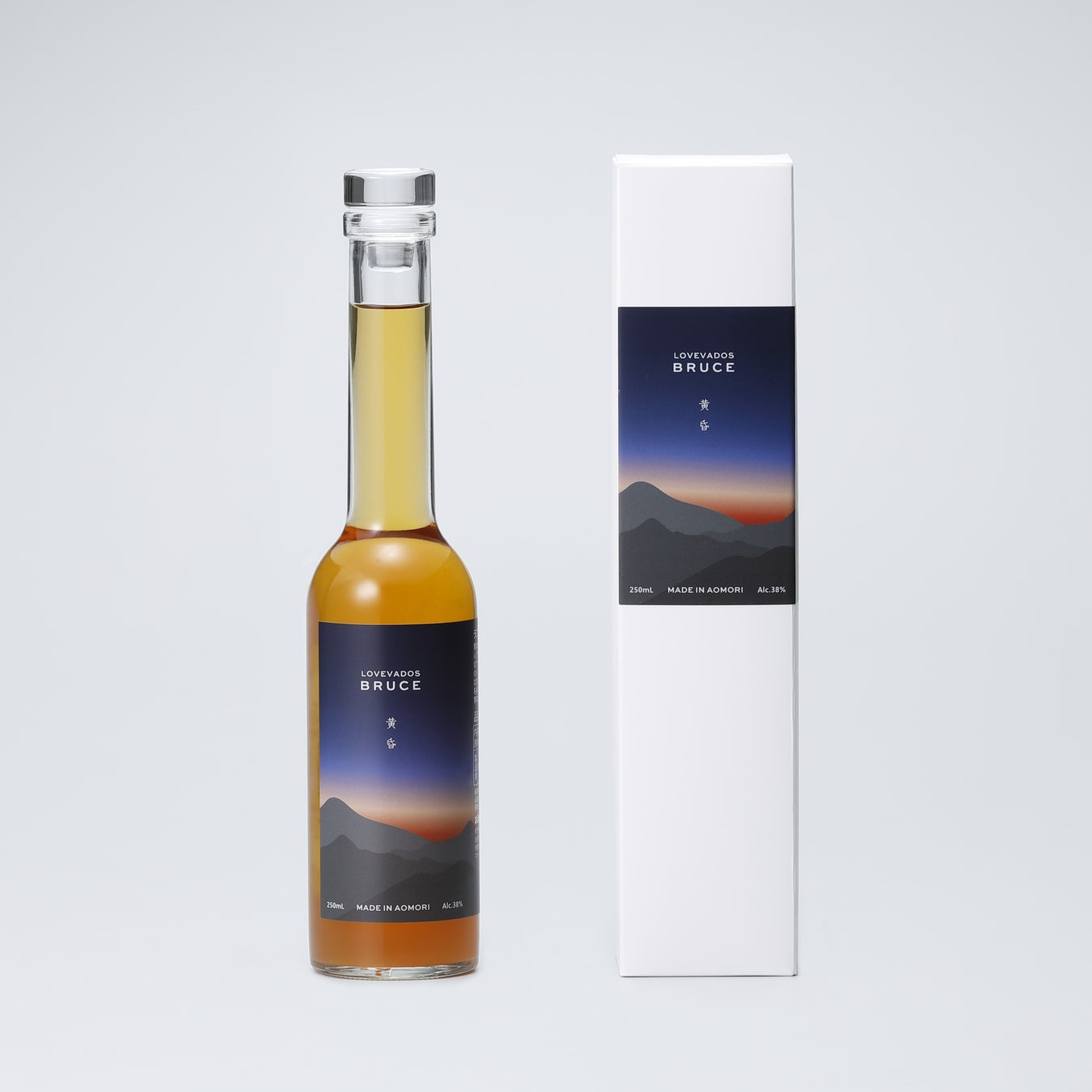 使っているアップルブランデーの樽由来の色合いと希少品種りんごのレンガ色の果汁が合わさることで、青森の日本海側からみられる黄昏時の色合いに似ていることから『BRUCE 黄昏』に。
