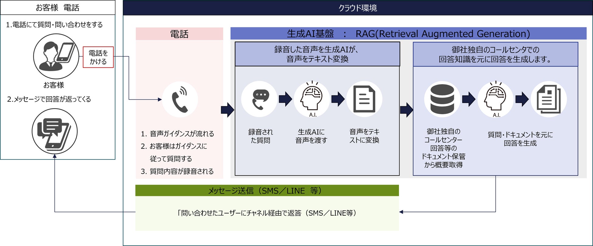 本サービスでは、こうした反復的な電話業務をAIが代行。通話を文字起こしし、企業のナレッジを基に回答をAIが生成、SMSやチャットツール経由で自動返信するという流れをすべて自動で処理することで、オペレーターの負担を軽減し、応答の均質化とスピード向上を実現します。 さらに、企業独自のFAQやナレッジベースを組み込んだRAG(Retrieval-Augmented Generation)により、正確かつ企業固有の情報に基づいた回答生成を実現しています。