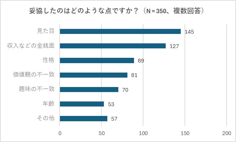 妥協した点については、「見た目」という回答が最多で、次いで「収入などの金銭面」が続く結果となりました。