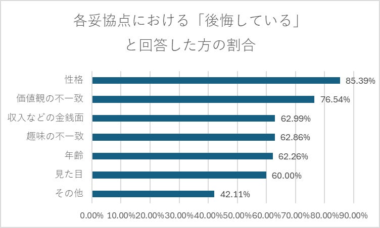 まず「かなり後悔している」、「少し後悔している」と回答した方の割合がもっとも多かった妥協点は「性格」で85.39%、次点で「価値観の不一致」が76.54%という結果になりました。