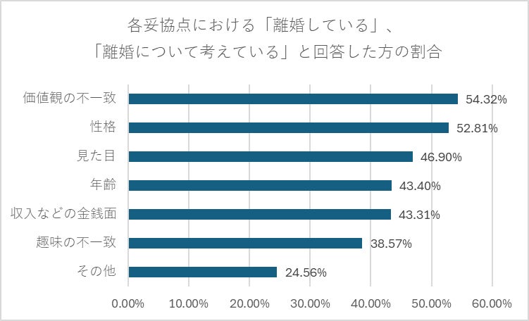 次に「すでに離婚している」もしくは「離婚について本気で考えている」、「離婚について少し考えている」と回答した方の割合が多かった妥協点は「価値観の不一致」が54.32%、次点で「性格」が52.81%という結果になりました。