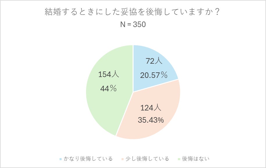 結婚時にした妥協に後悔していると回答した方が半数を超えている反面、妥協はしたものの後悔はしていないと回答した方も44%と決して少なくはない結果です。 ※対象412人中350人が回答