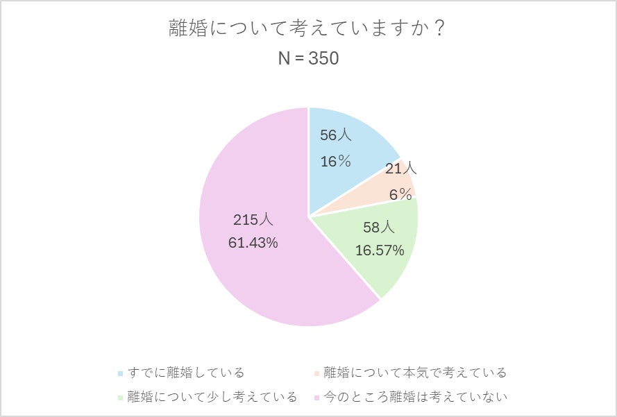 すでに離婚している、もしくは離婚について考えていると回答した方の合計は、アンケートにご回答いただいた350人中135人(38.57%)となります。 ※対象412人中350人が回答
