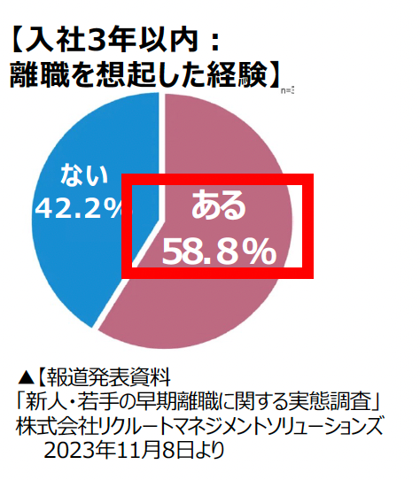近年、⼊社3年⽬までのZ世代の早期離職が課題となっており、離職率が3割を越え(32.3%)となっています。更に、退職を考えたことがある社員まで含めると、約6割(58.8%)という結果が出ております。