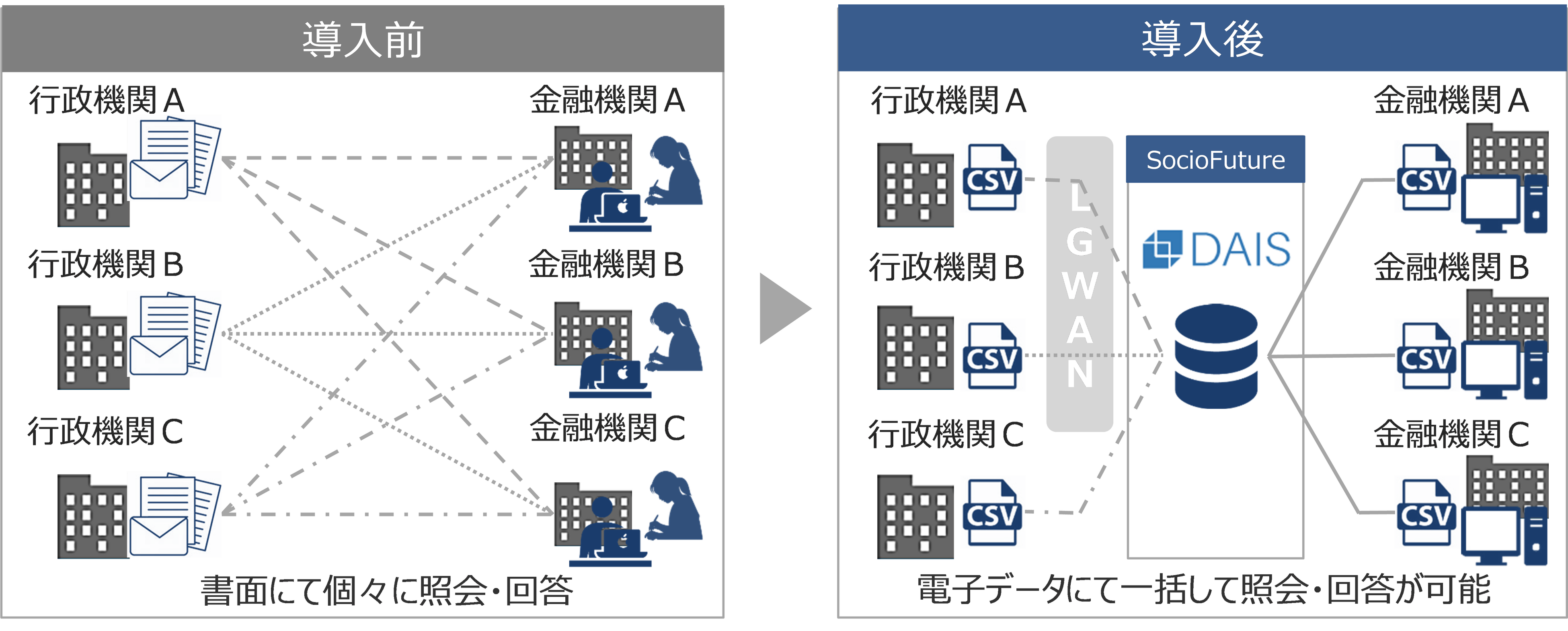 岩手県内では預貯金等照会が紙の様式を用いて行われており、金融機関、行政機関双方の職員の事務負荷が課題となっていました。DAIS導入後は、行政機関から金融機関に対する預貯金等照会および金融機関の受付・回答がデジタル化され、双方の事務負担軽減に繋がっています。