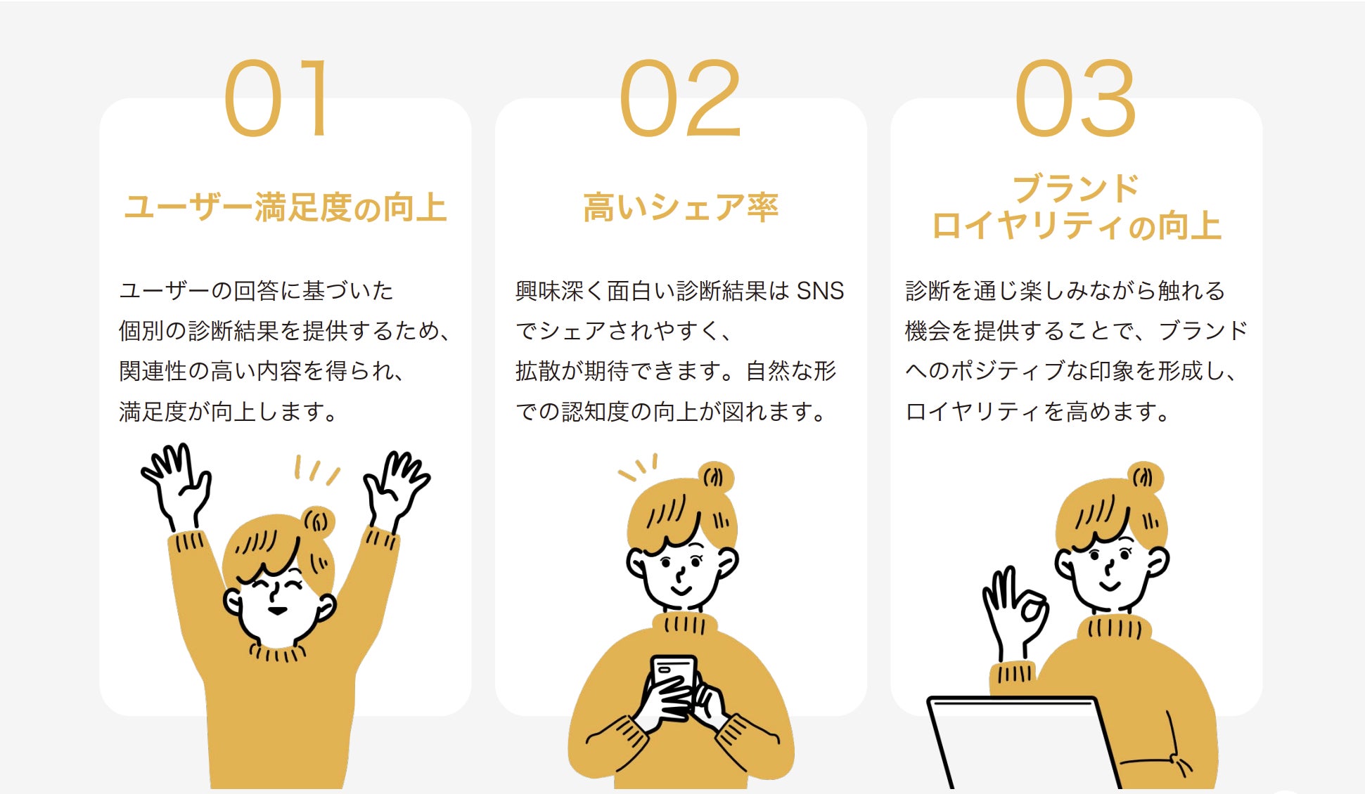 診断コンテンツは、ユーザーが質問に答えることで、パーソナライズされた結果やアドバイスを得られるインタラクティブなコンテンツです。ゲーム感覚で楽しめるため、ユーザーの興味を引きつけ、ブランドとのエンゲージメントを高める効果が期待できます。