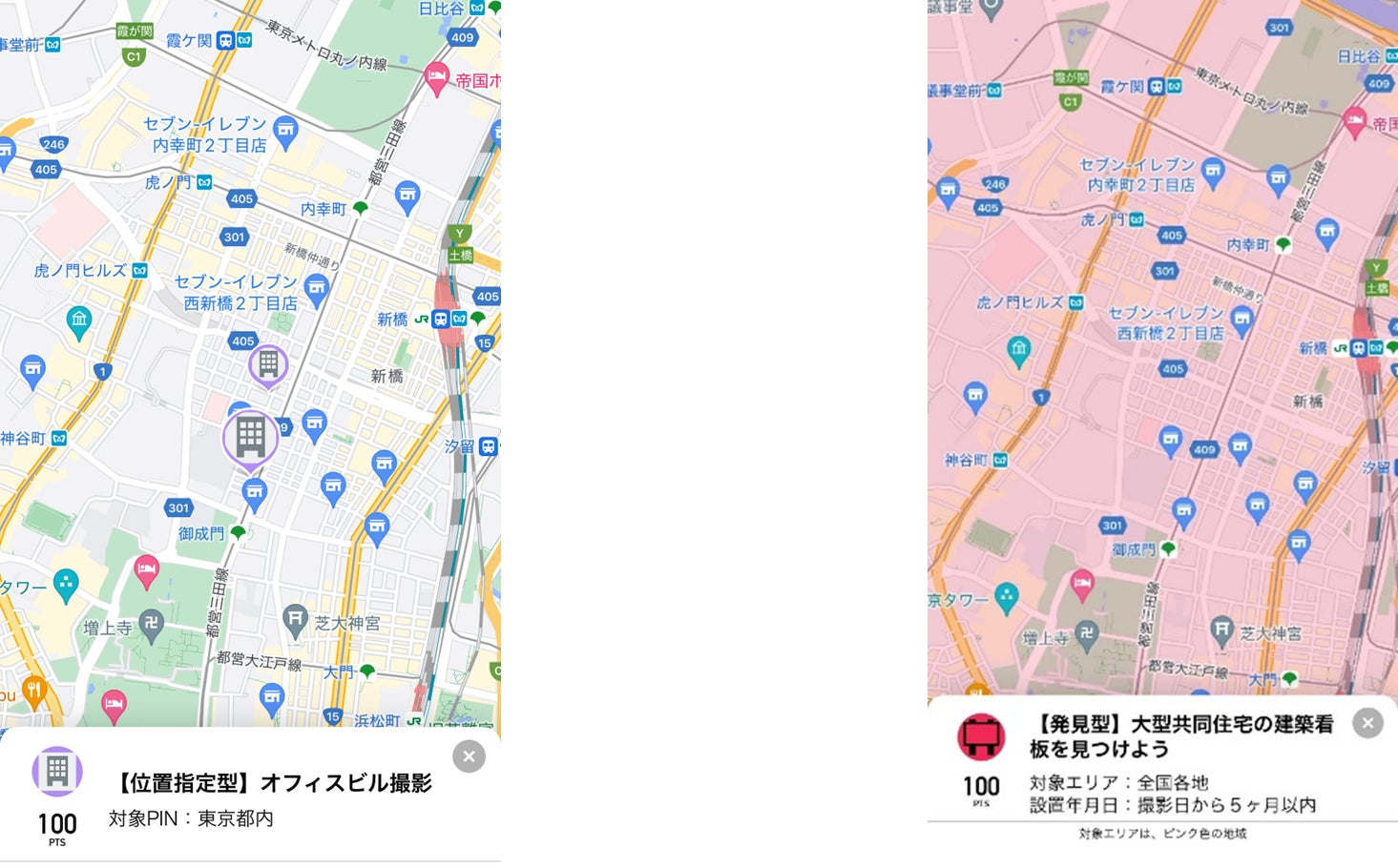対応可能な案件には①位置指定型と②発見型の2種類があります。位置指定型は、指定された箇所での写真撮影など、ピンポイントで必要な情報を収集します。発見型は対象エリア内で、必要な情報を発見した際に報告します。