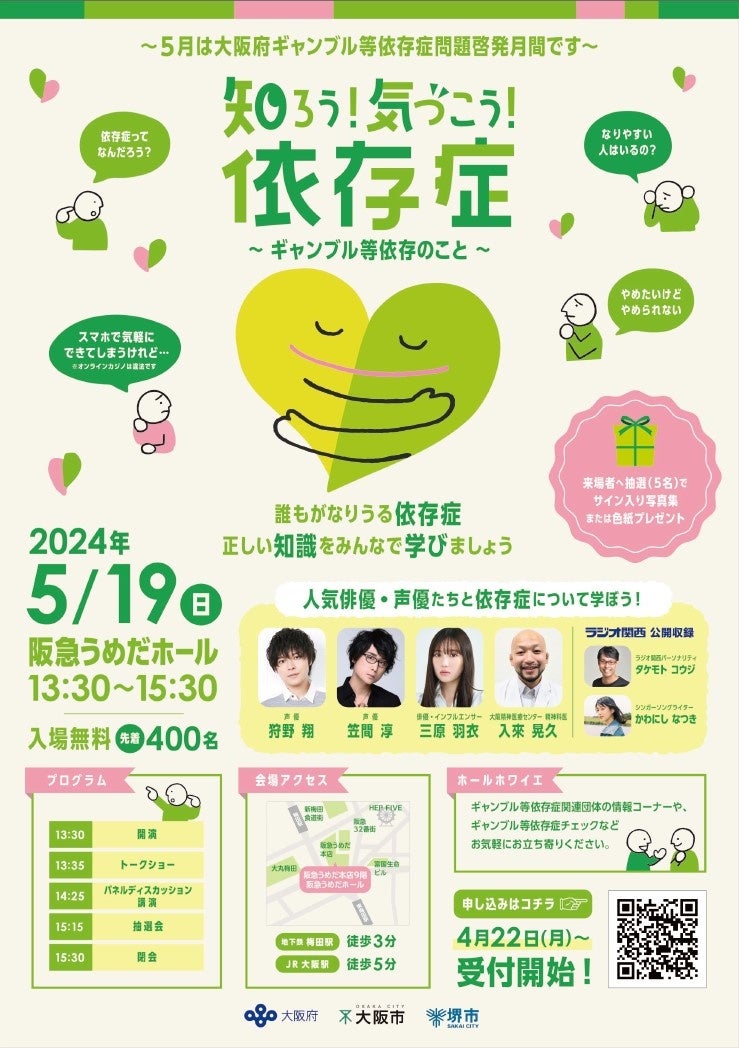 大阪府では、令和4年度に制定された「大阪府ギャンブル等依存症対策基本条例」において、毎年5月をギャンブル等依存症問題啓発月間と定め、府民の皆様にギャンブル等依存症問題への関心と理解を深めていただくため、さまざまな啓発活動に取り組んでいます。