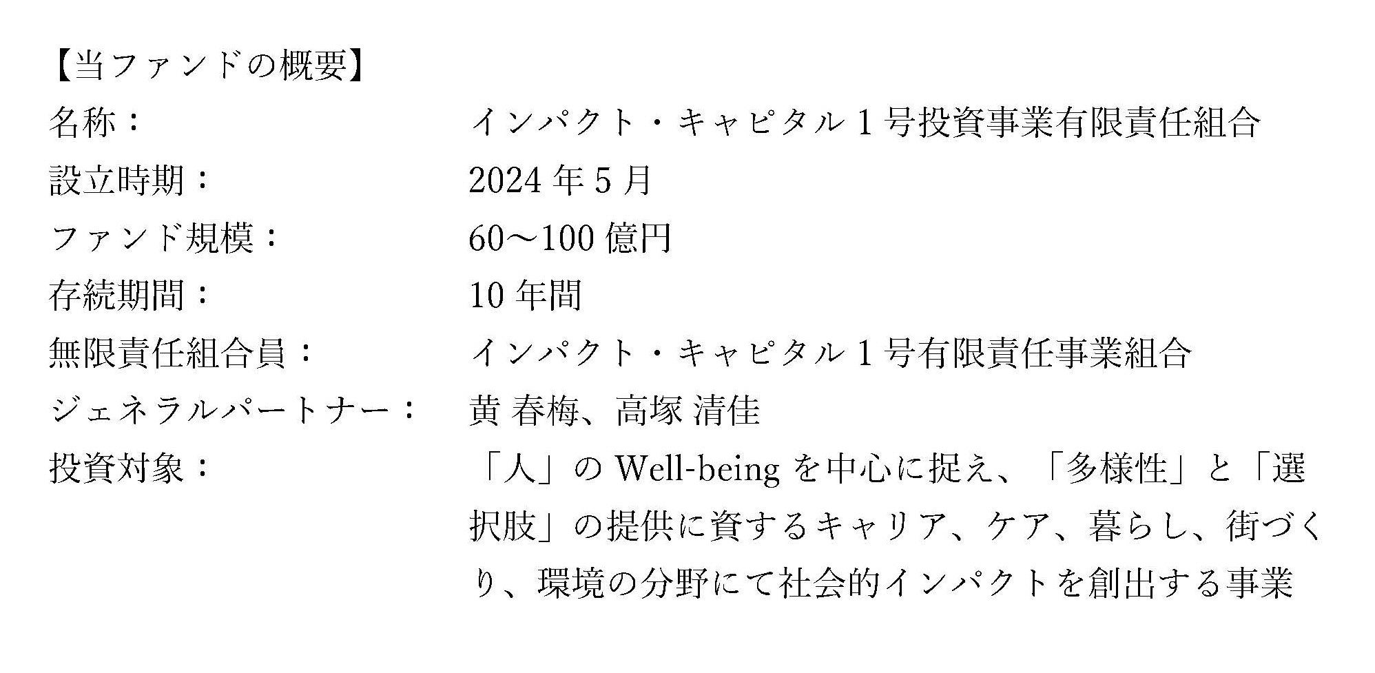 当ファンドでは、「『人』のWell-beingを追い求めるインパクト投資」をミッションに掲げ、「多様性が認められ、かつ、価値観に基づいて選択することのできる、彩り豊かな社会の創出」に向け、インパクト投資を通じて貢献してまいります。