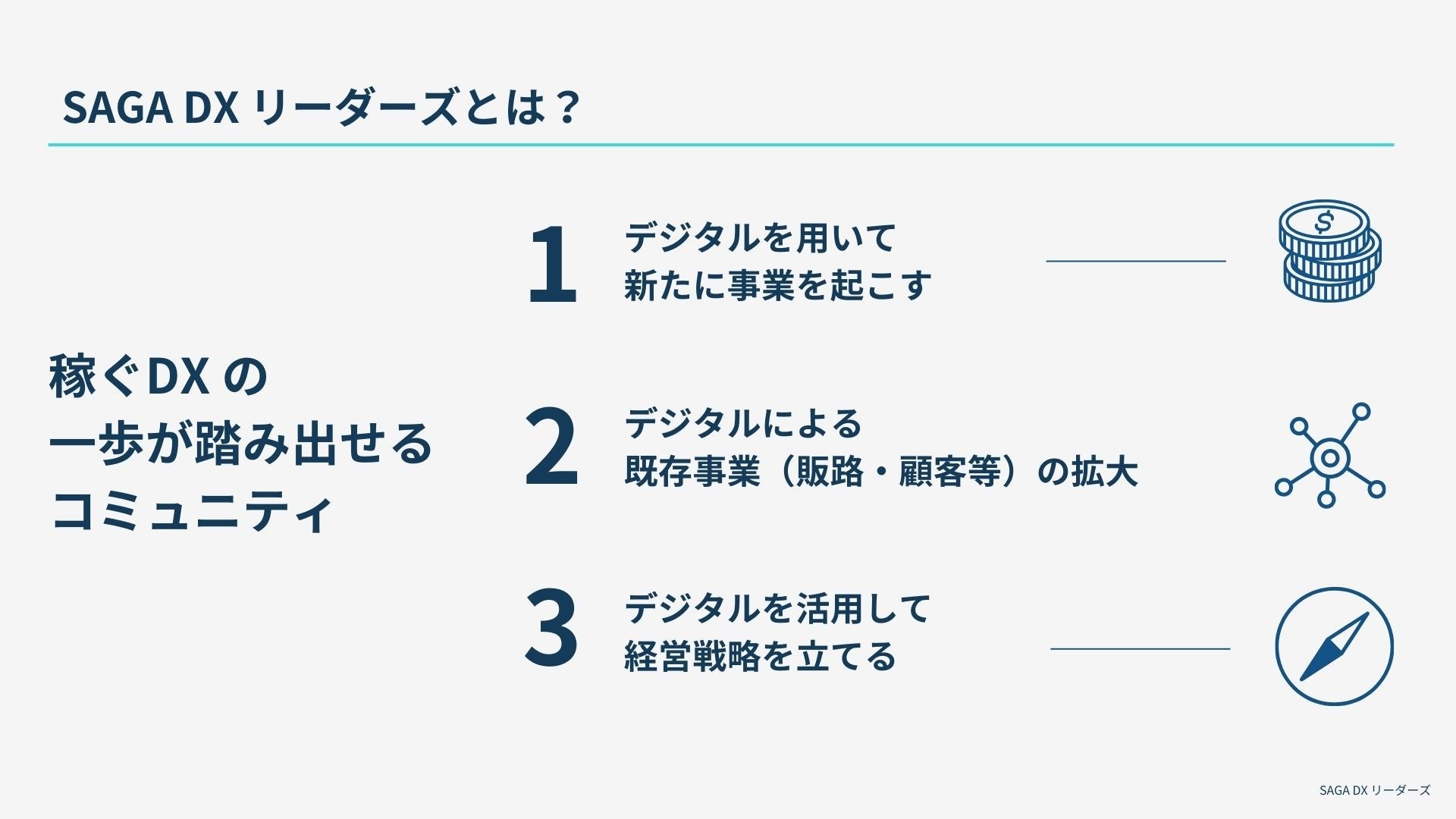 SAGA DX リーダーズとは、佐賀県の経営者・次期経営者を中心とした「稼ぐDXの一歩が踏み出せる」コミュニティです。 「事業そのものを変革し競争上の優位性を確立する」ために、必要なものは何か?経営課題から紐解いたテーマをもとに県内外の経営者と共に学びます。 コミュニティ内では、「デジタルで稼ぐ」をテーマに、DX推進を加速させていくようなイベント・情報発信を行います。