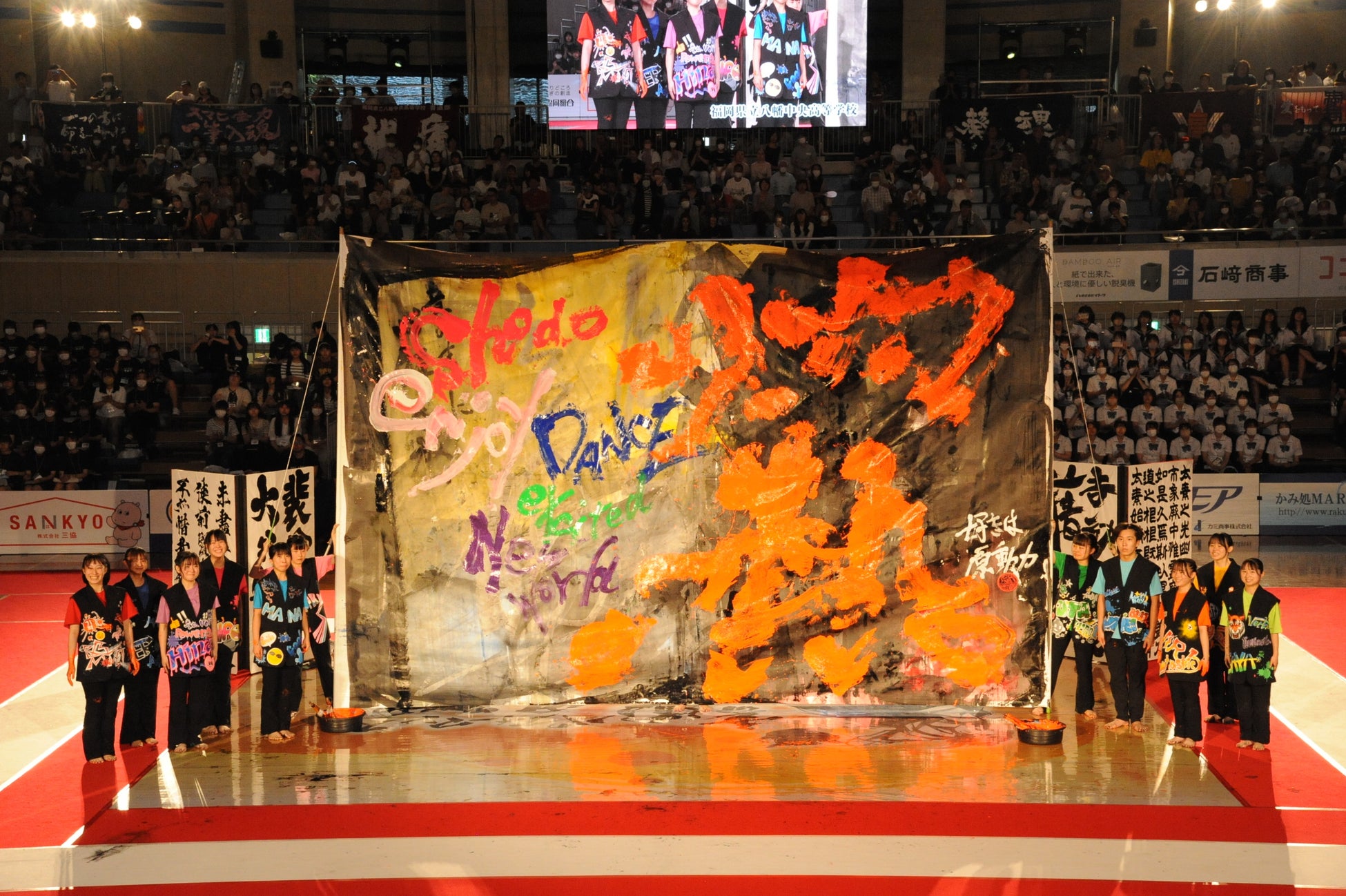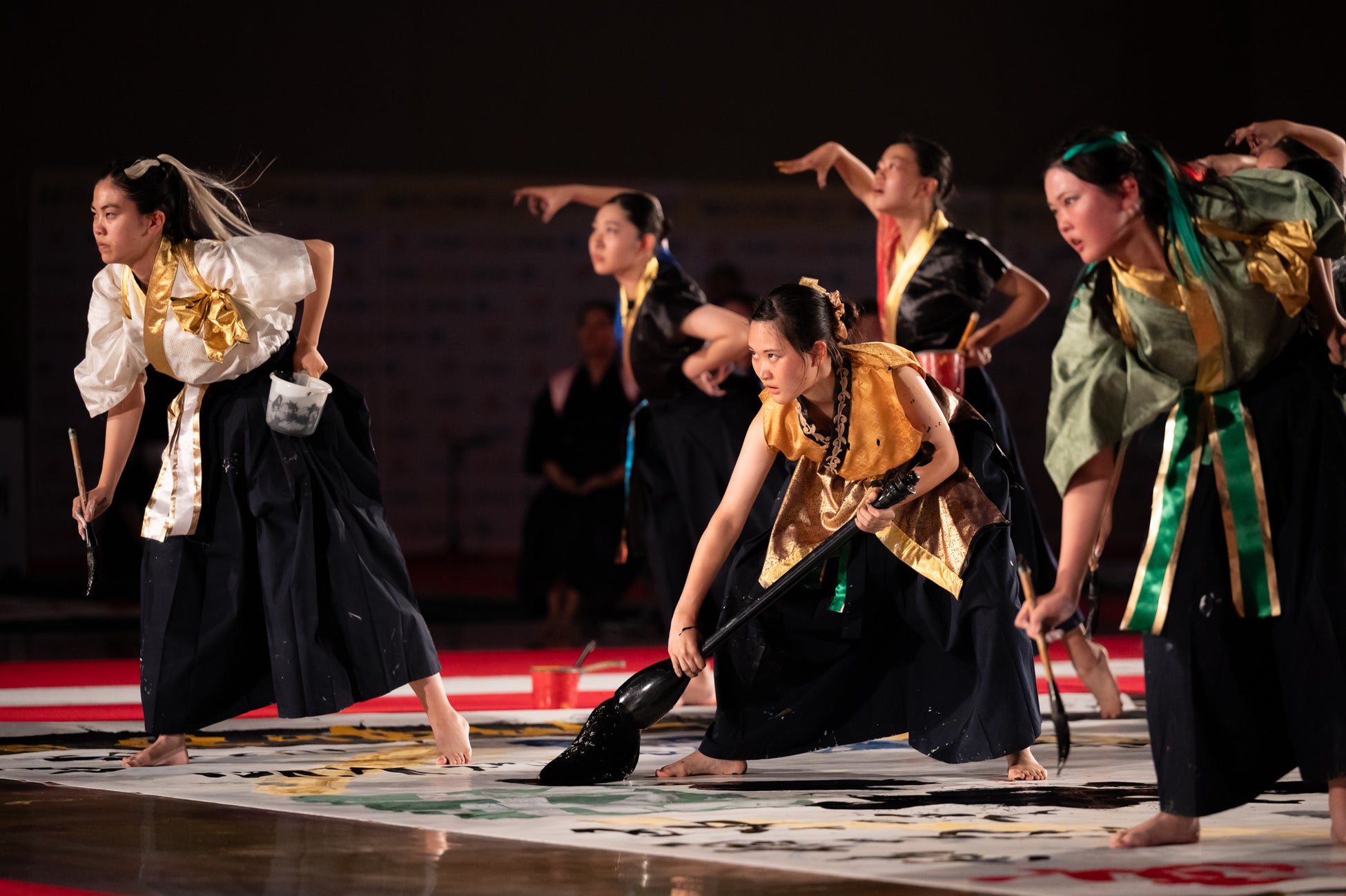大会は演技時間6分間の中で、縦4m×横6mの巨大な用紙に向かい、音楽に合わせて様々なパフォーマンスをしながら自分たちの思いを揮毫します。書道パフォーマンスは、不断の努力とチームワークをもとに、書と演技の美しさを競う、まさに総合芸術です。