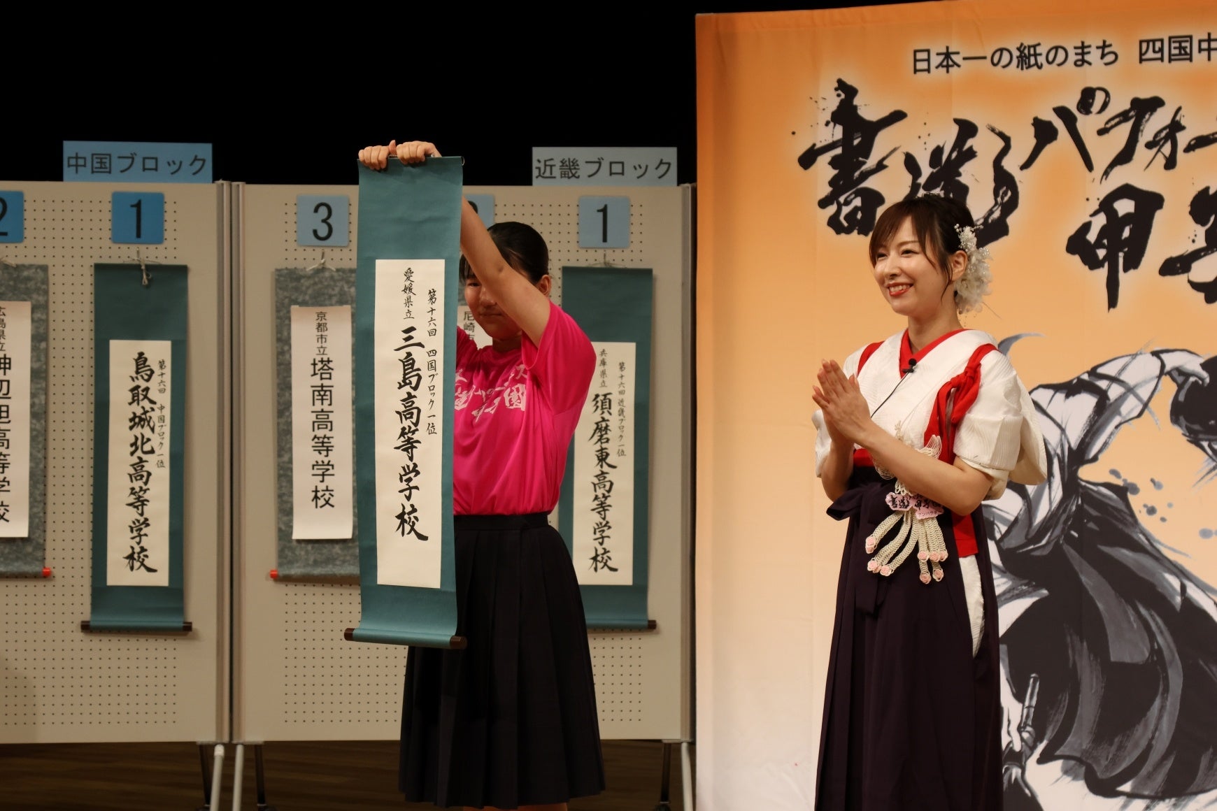 概況:第16回大会を制したのは、激戦の中国ブロックを勝ち上がった鳥取城北高等学校。悲願の初優勝を果たした。中島みゆきさんの「ファイト!」をアカペラで歌いながら、「闘え」と大書した。最低限の道具だけを用い、身体一つ、筆一本でこれまでにないパフォーマンスを披露した。心の弱さと向き合いながらも自分らしく闘おうとする想いを言葉にして、筆と歌声、そして身体表現のみで会場を魅了した。準優勝は、書道やダンスが「好き」という感情を長さ約3mの筆に込め「灼熱」と大書した福岡県立八幡中央高等学校。前人未踏の4連覇を目指した長野県松本蟻ヶ崎高等学校は、書の原点に立ち返った黒と白の世界を表現して3位だった。