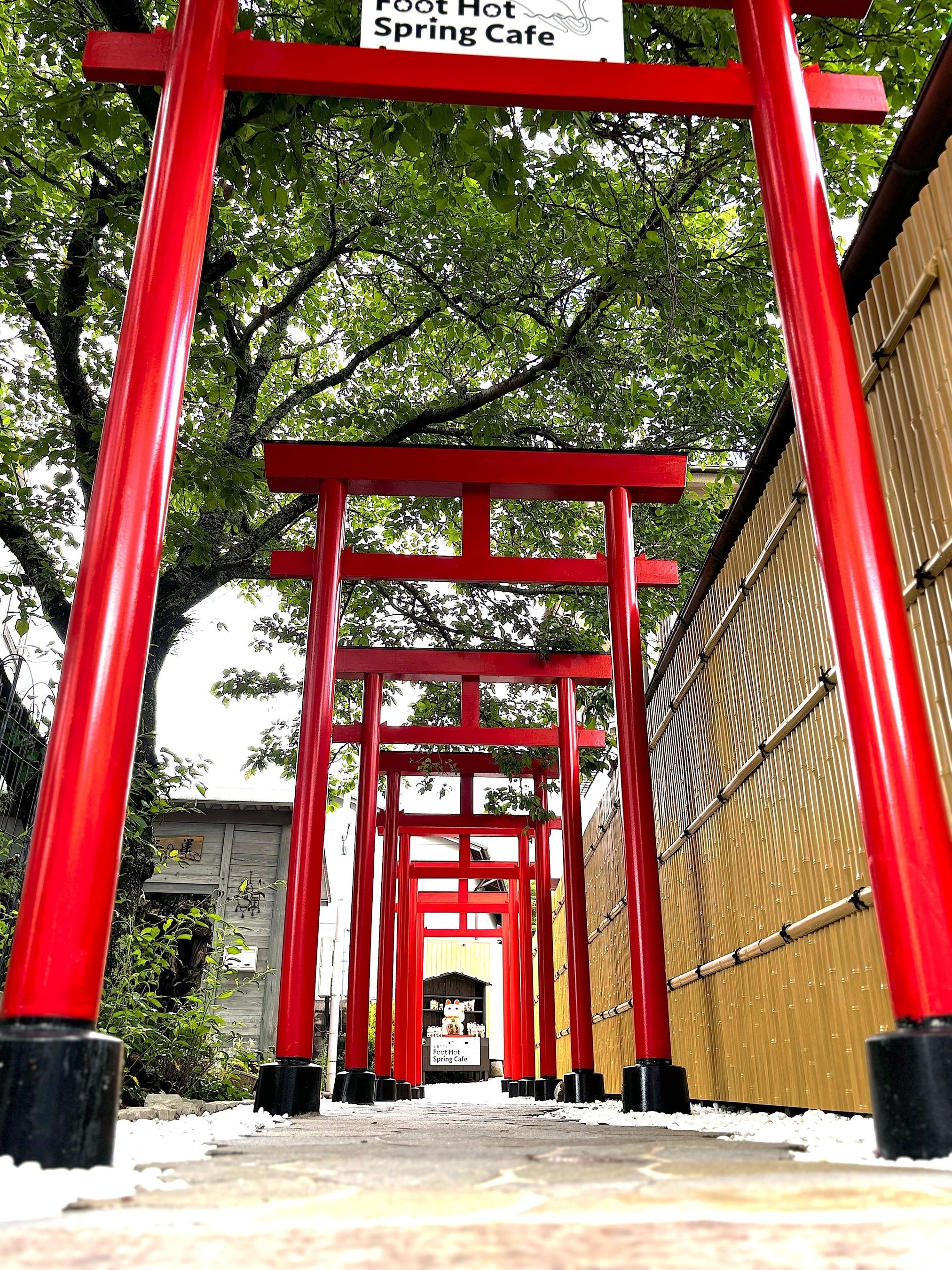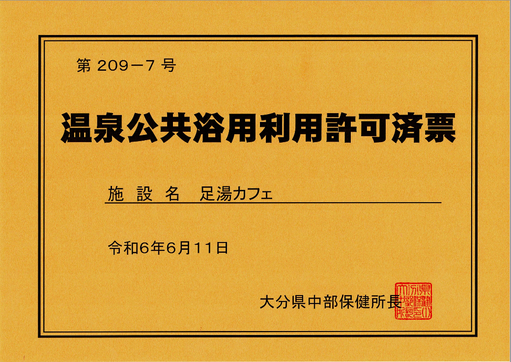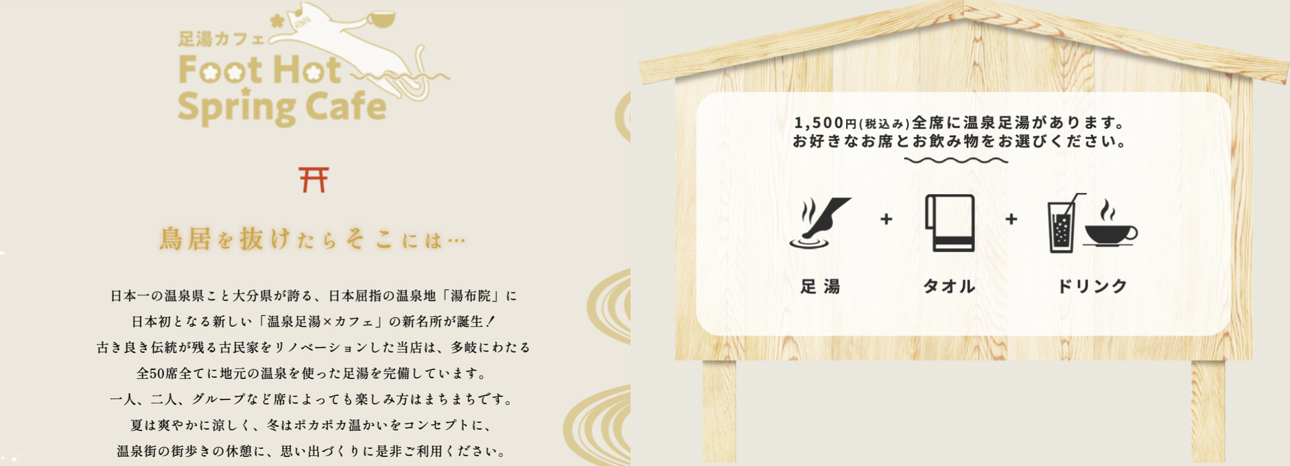日本一の温泉県を豪語している大分県のなかでも、日本中にその名をとどろかせる有名温泉地「湯布院」に作りました。「足湯(水道水のお湯)が隣接したカフェ」や「天然温泉の足湯席も一部あるカフェ」などは、過去にもありましたが、「温泉地にて、全席に天然温泉足湯が完備されている足湯カフェ(温泉公共浴利用許可済票も取得済み:2024年6月)」は前例がなく、日本初にして唯一であると考えています。 ※自社調べ