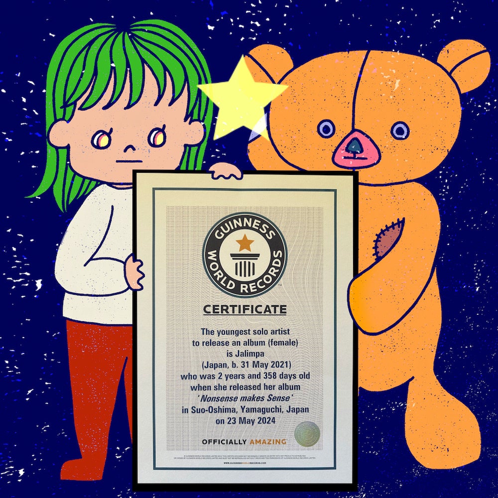 瀬戸内海の周防大島育ちの野生児シンガーソングライターJalimpa(ジャリンパ)が、2歳358日でリリースしたアルバム『Nonsense makes Sense』で、「アルバムをリリースした最年少ソロアーティスト/The youngest solo artist to release an album」としてギネス世界記録に認定されました。