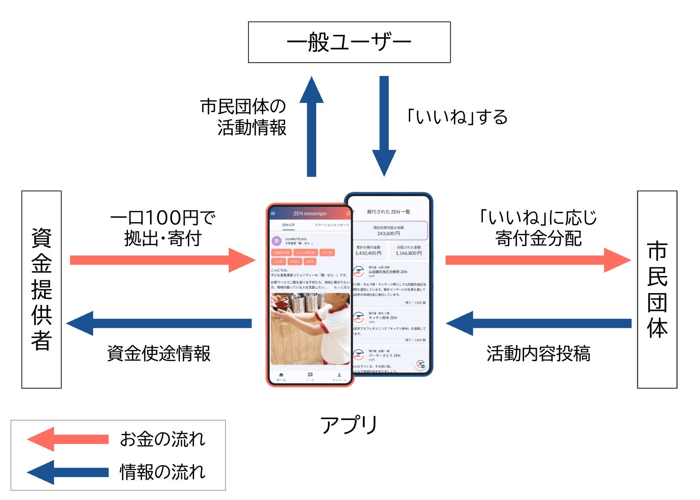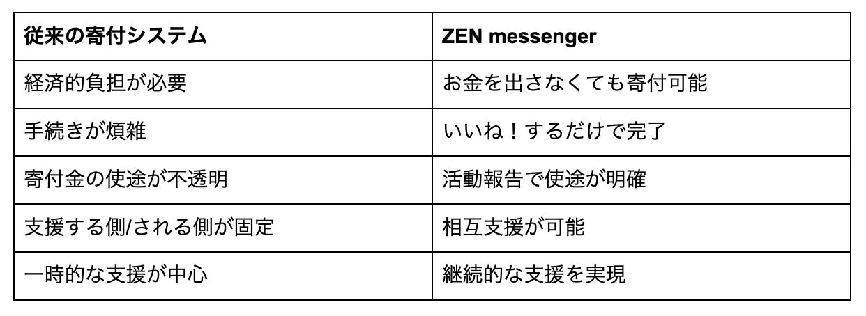 ZEN messengerの最大の特徴は、地域住民が「いいね!」をすることで寄付を"実行"できる点です。市民団体の活動報告にいいね!をすることで、スポンサー企業や有志市民の支援金の一部(100円〜)が自動的に分配される仕組みにより、従来の寄付システムが抱える課題を解決しています: