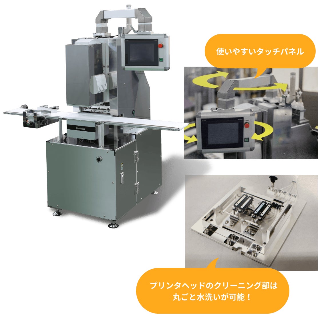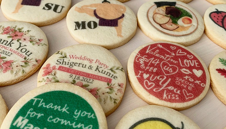 食べ物に直接インクジェット方式にて文字やイラスト、写真などが印刷できるプリンターのことです。食べられるインク(合成・天然から選択可能。)を使用し、非接触・非加熱で色彩豊かな印刷が可能なフードプリンターを製造・販売しています。版や焼印が不要な為、一度に様々なデータを印刷することができます。