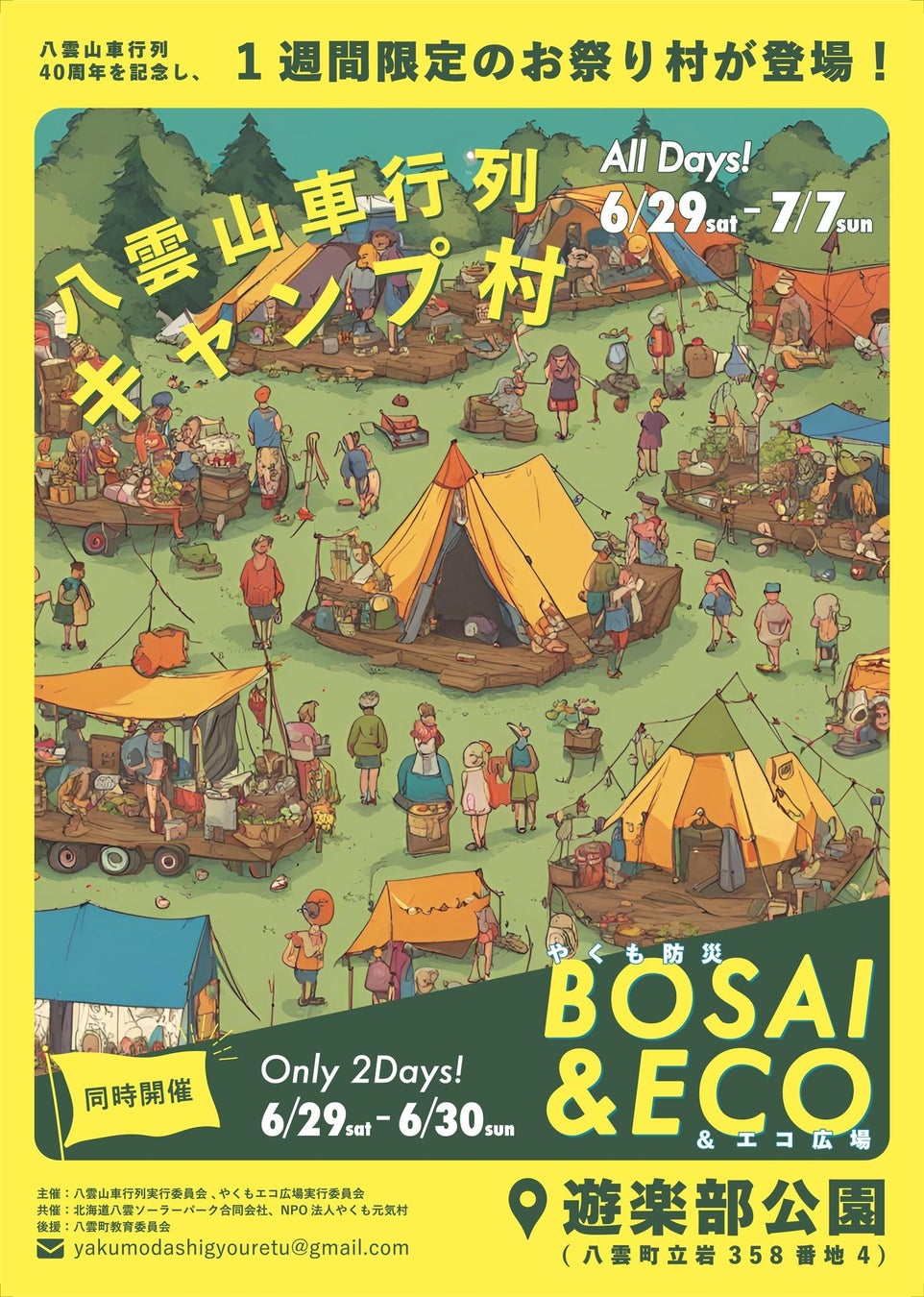 【やくも防災&エコ広場】2024年6月29日12時~21時、6月30日10時~15時 【八雲山車行列キャンプ村】2024年6月29日~7月7日 |