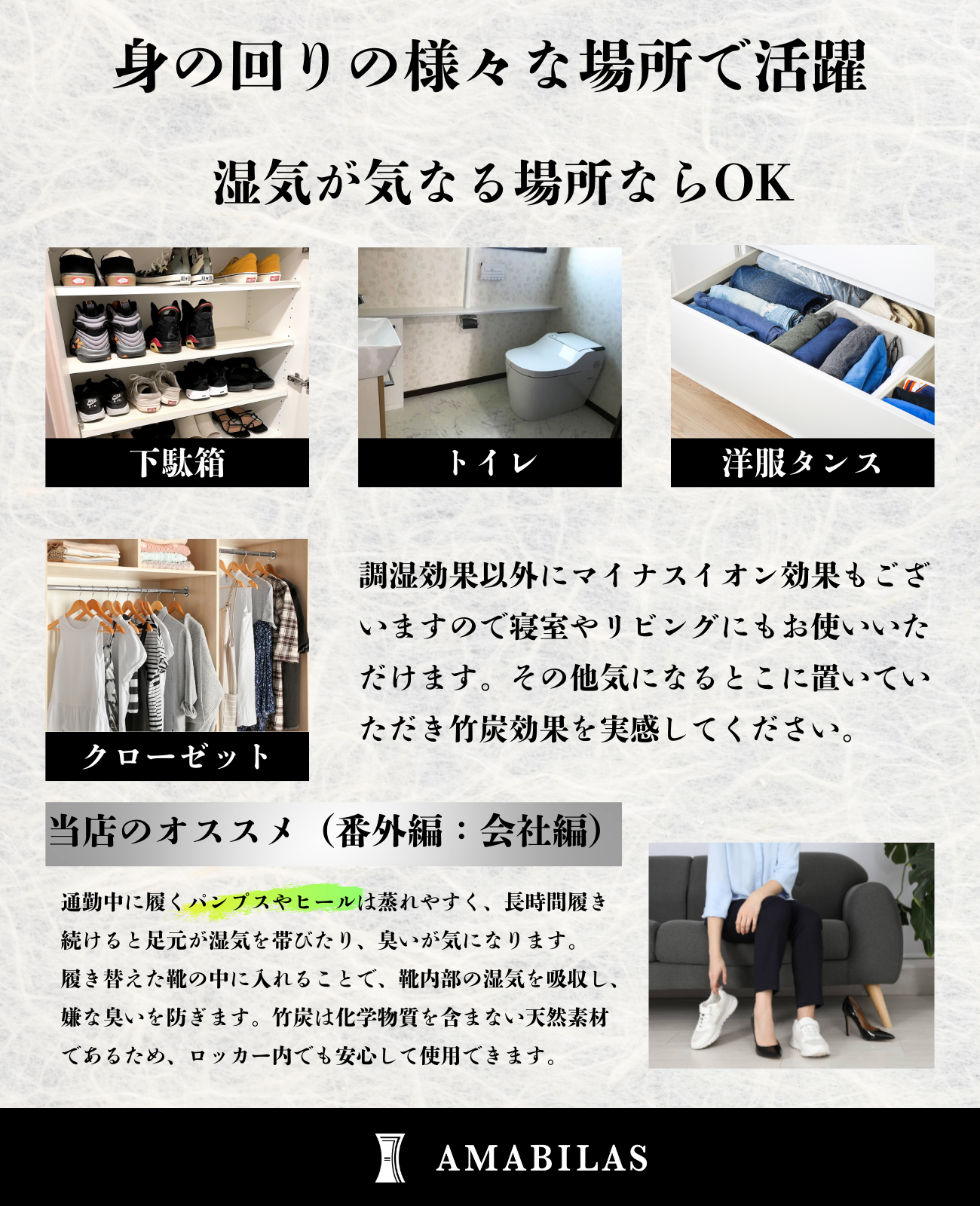 開発に踏み切ったものの、竹炭に関して当社はまったく知識がありませんでした。そこで、竹炭を作っている窯元や、臭気判定士の方など各分野の専門家の力をお借りしながら、約1年かけて「活き竹炭」を完成。その特徴は、真空パックにしていることだけではありません。以下に、本商品の特徴をまとめました。