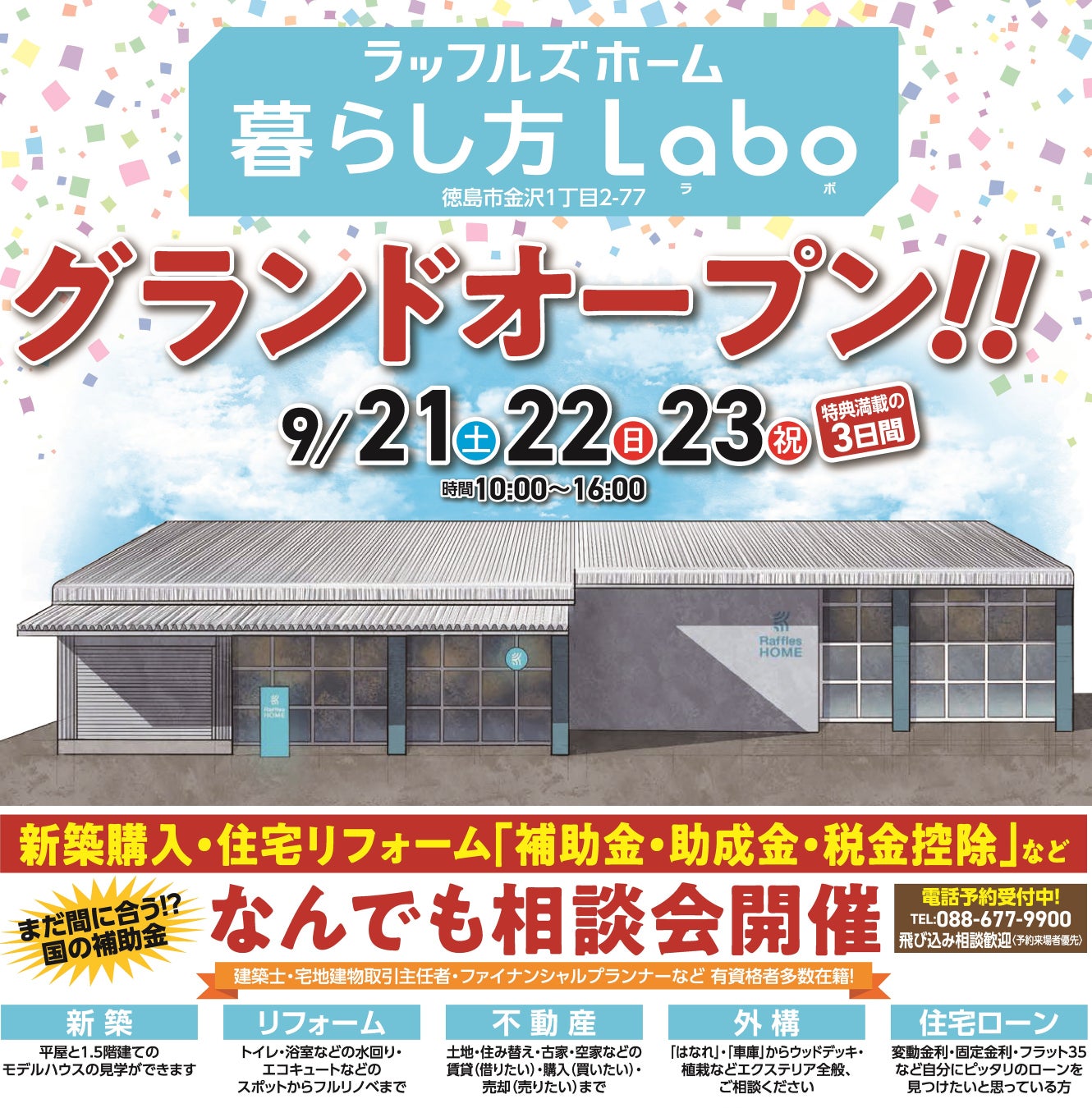 2024年9月、創業69年の老舗工務店・ラッフルズホーム株式会社(本社:徳島県徳島市東吉野町2-45-9、代表:金原 建雄)は、徳島市金沢1丁目にショールーム「暮らし方Labo(くらしかたラボ)」を新規オープンさせます。来年70周年を前にリブランディングを実施し、ロゴマークやイメージカラーを刷新するだけでなく家というモノの提案から「暮らし方」全般をトータルデザイン提案する拠点として誕生します。また、9/21(土)・22(日)・23(月・祝)には豊富な特典を用意したグランドオープンイベントを開催いたします。