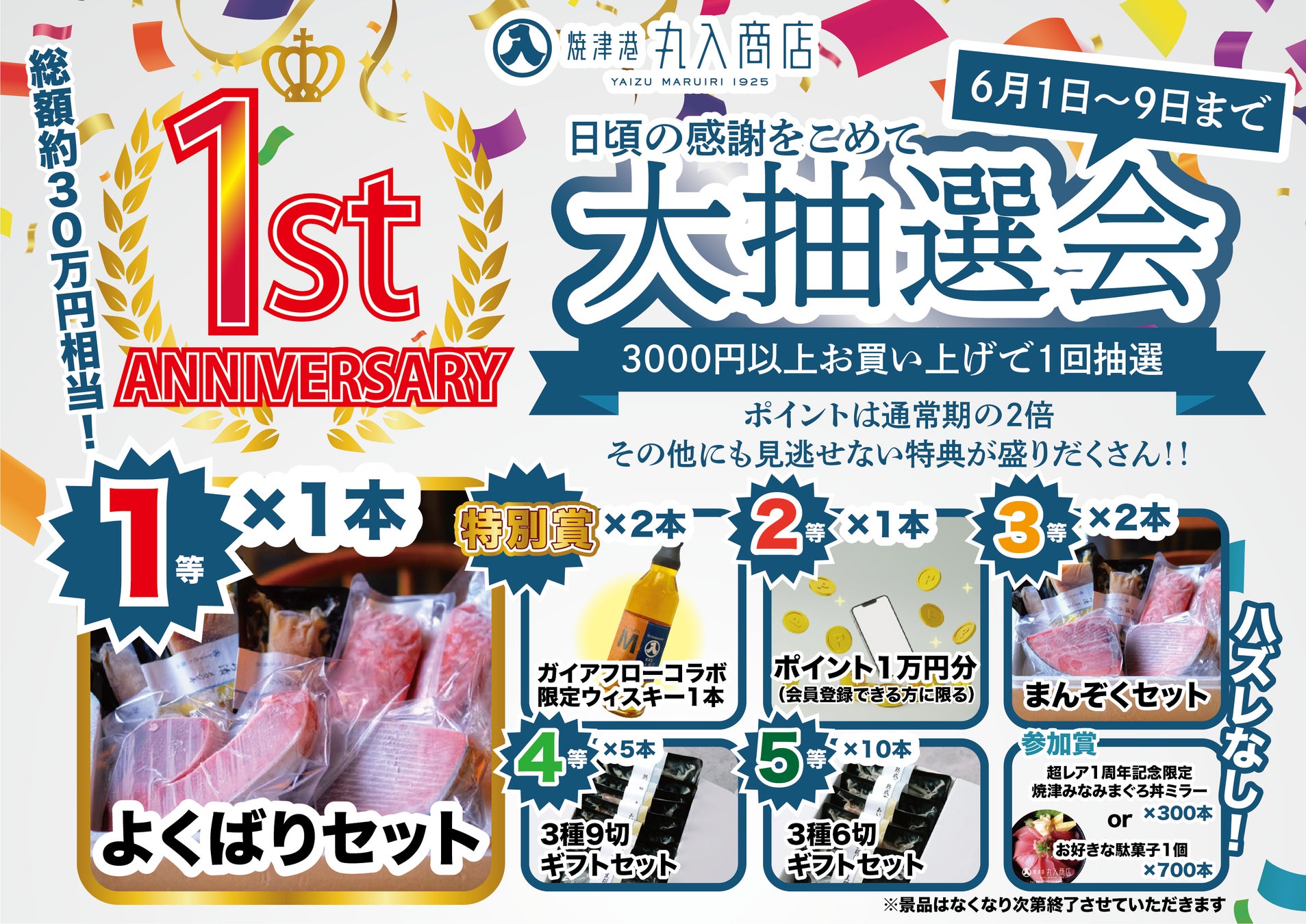 祝1周年『焼津港丸入商店 焼津総本店』は日頃の感謝を込めて大感謝祭を実施します。総額30万円相当のデジタルガチャを回せる「抽選会」を「6月1日~6月9日」の9日間で行います!