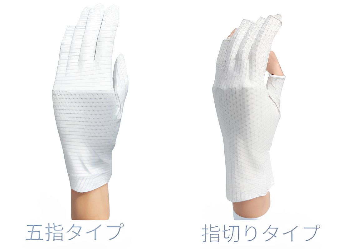 お客様の使い方に合わせて、細かい作業がしやすい「指切りタイプ」と手全体を優しく包み込む「五指タイプ」の2種類をご用意。優れた伸縮性があり、全7色のカラーバリエーションで、男女問わずS・M・Lの3サイズ展開でご使用いただけます。UV遮蔽率90%以上で、手肌を日差しからしっかり守ります。
