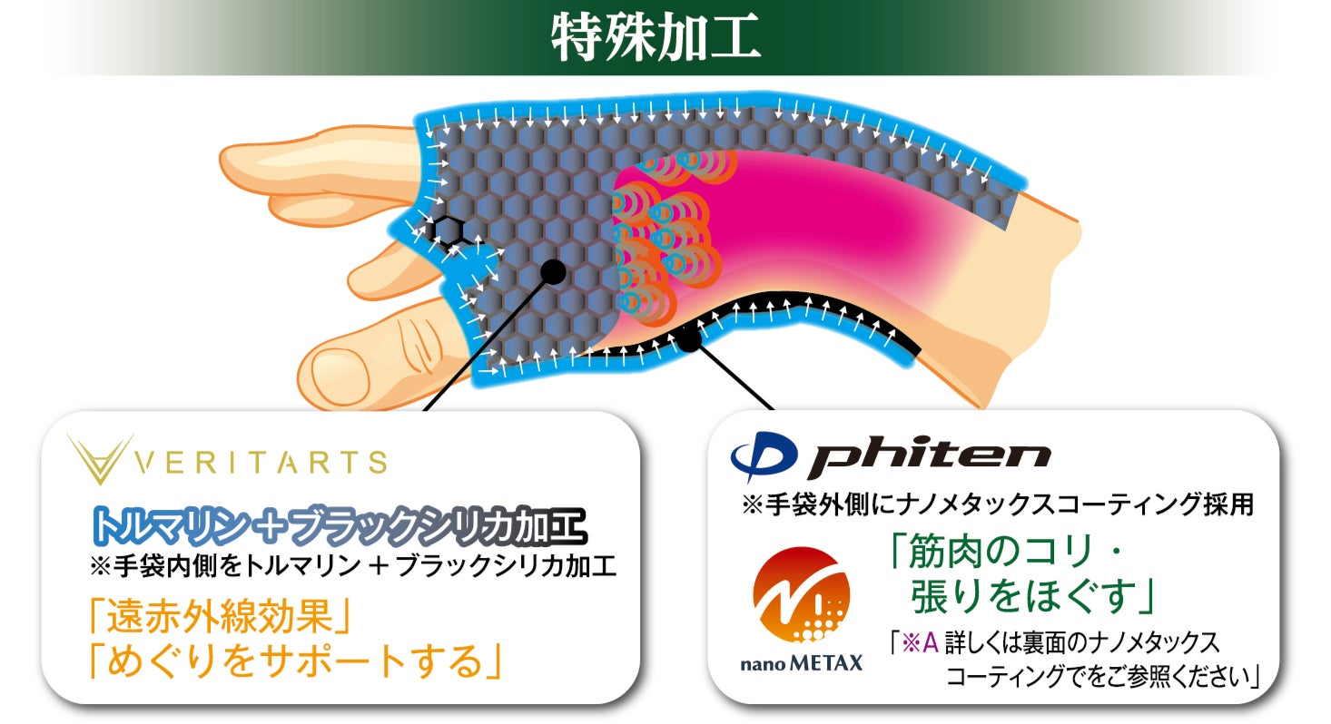京セラでのセラミック開発経験から、遠赤外線や圧電効果を持つトルマリンやブラックシリカが健康に有益であることを知っていた荒山は、これらを組み合わせた「ジュエルケア」素材を開発。さらに、ファイテンのナノメタックスコーティングを加えることで、トリプル効果を生み出すグローブを完成させました。