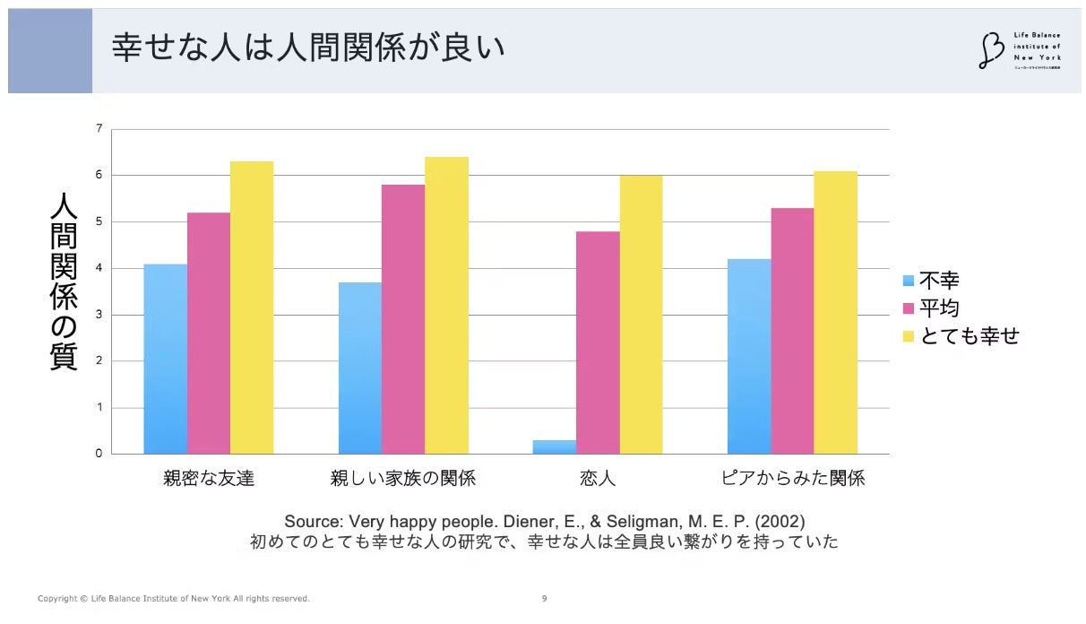 松村は、幸せになる科学的な方法を研究するポジティブ心理学を伝えていますが、ポジティブ心理学の研究では、幸せな人には必ず「良い人間関係がある」ということが明らかになっています。(Very happy people.Diener.E.&Seligman,M.E.P(2002))