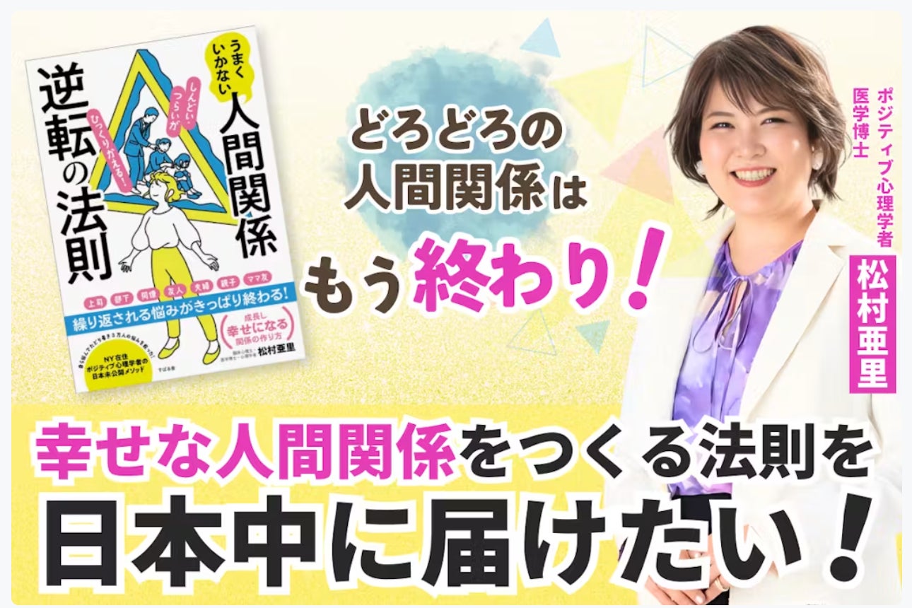医学博士・臨床心理士・ポジティブ心理学者の松村亜里が、2024年6月1日(土)より、クラウドファンディング「どろどろの人間関係はもう終わり! 幸せな人間関係をつくる法則を日本中に届けたい!」をスタートしました。