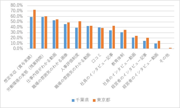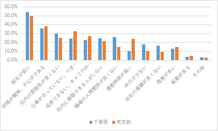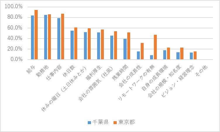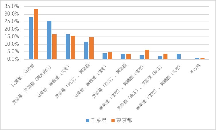 転職先に関しては、都内勤務者の方が「同業種・同職種」への転職を希望する割合が高く、「異業種・異職種」へ転職希望する割合は千葉勤務者の方が高いという結果が出ています。都内勤務者の方が現在のキャリアを活かして転職先を検討する志向が強く、一方の千葉勤務者は、現在のキャリアを活かすこと以上に、勤務地や給与、残業時間、職場の人間関係など別の要素を重視する傾向があると捉えることができるかもしれません。