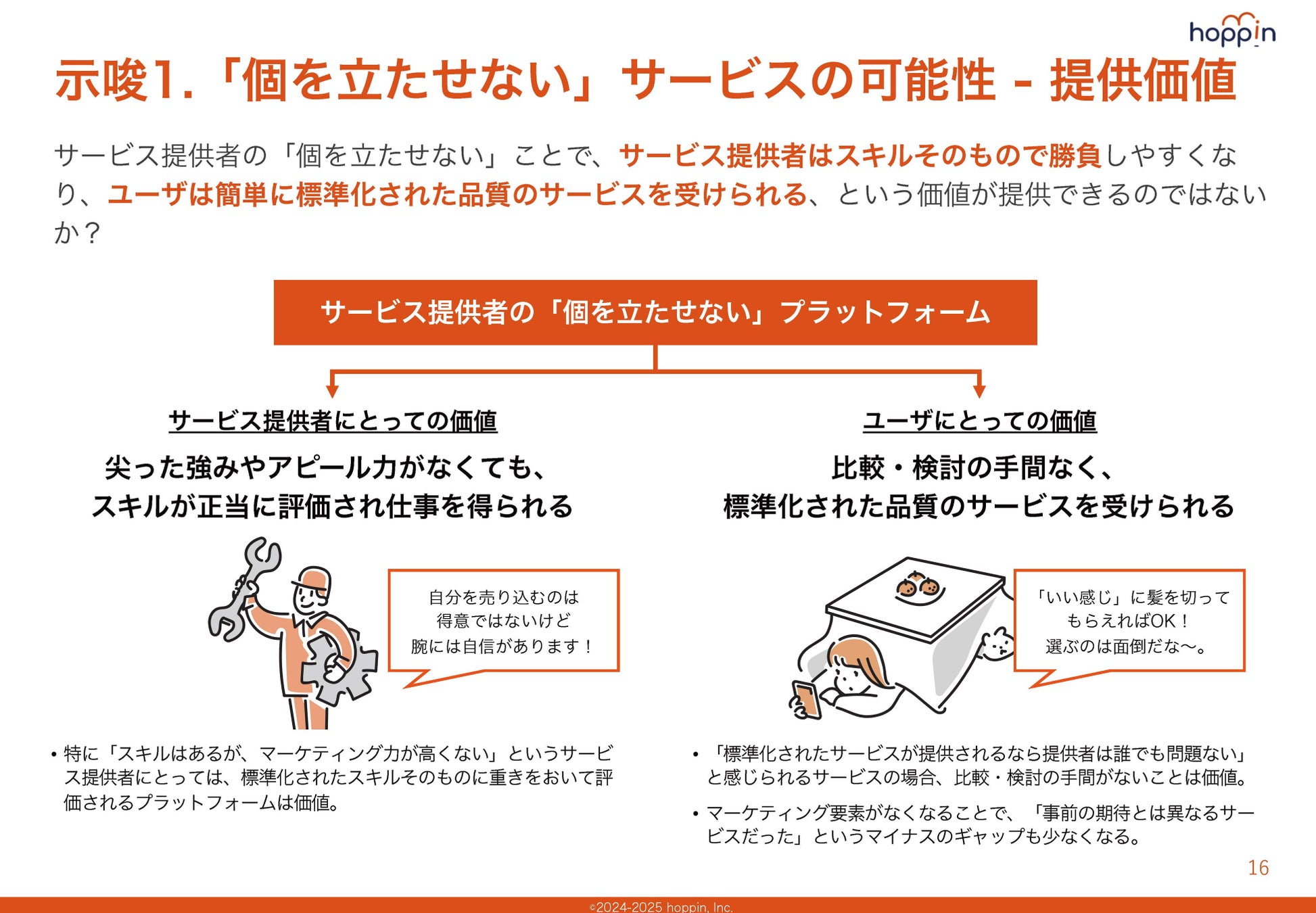 ユーザにとっては、質は十分であるのに価格が安い(コスパが高い)点、家まで来ていただける(利便性が高い)点、ユーザーがサービス提供者を選ぶ手間がない点がメリット。