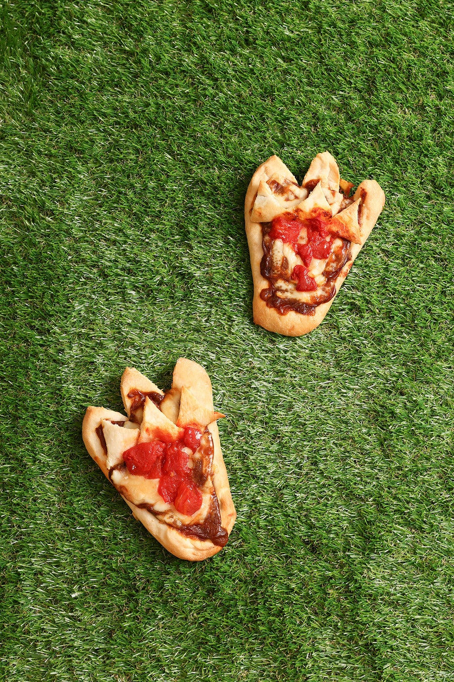 恐竜の足跡の形をしたカレーとトマトのナン生地ピッツァ!