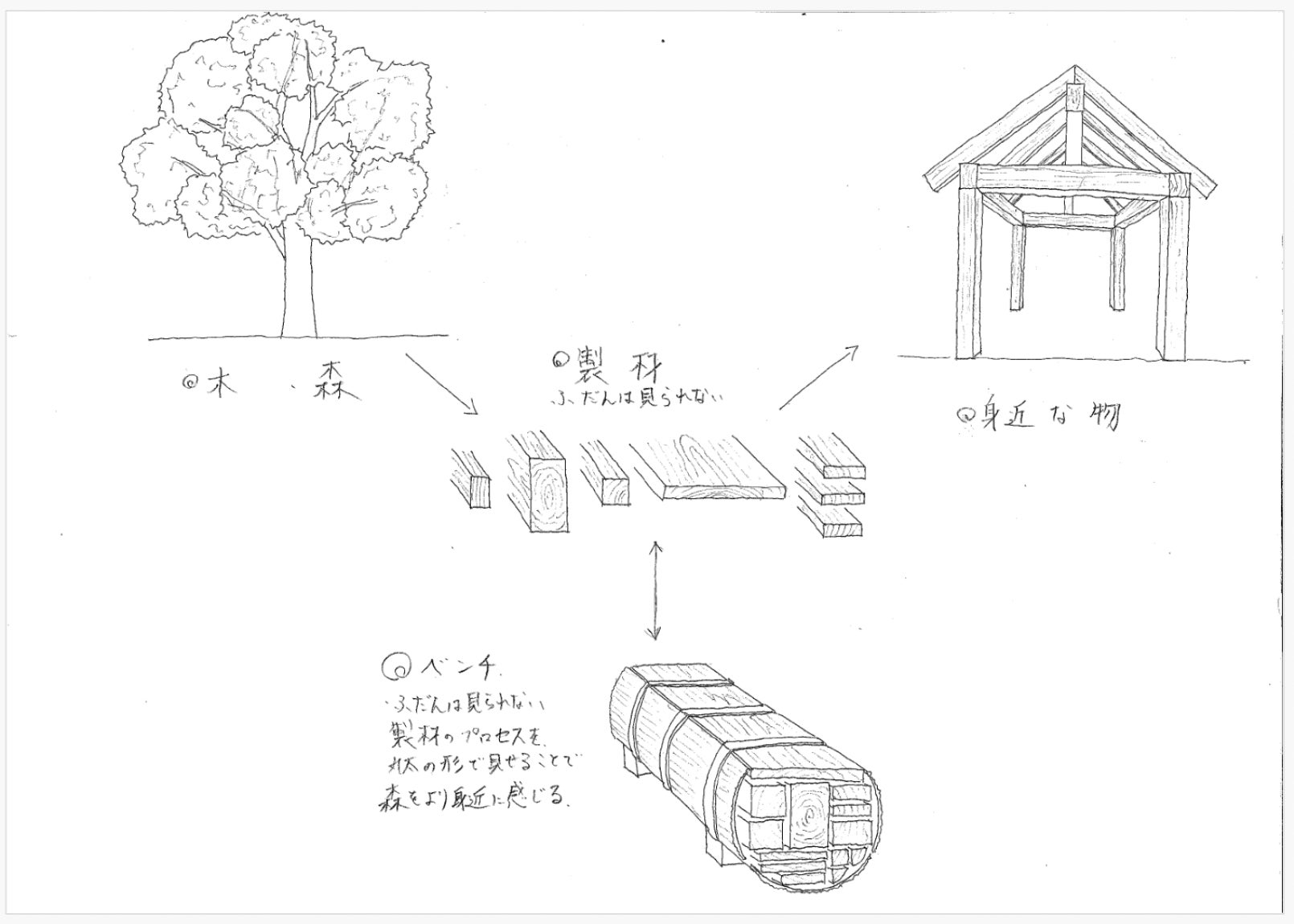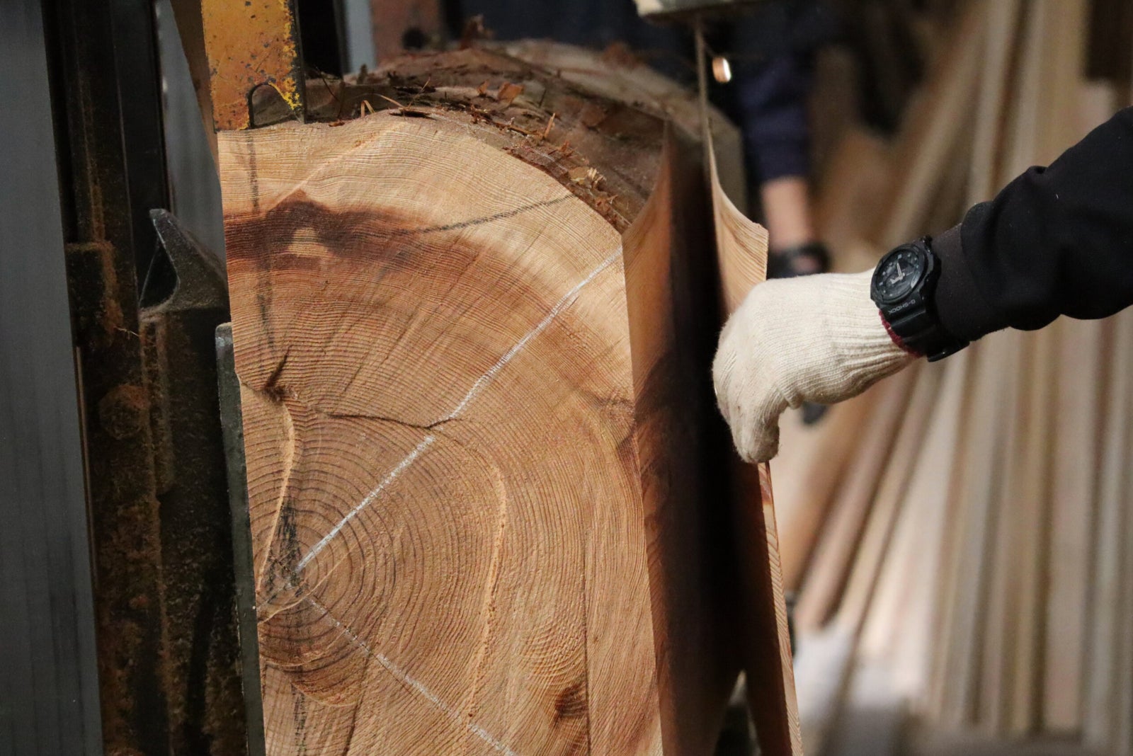 目の前の何十年も生きてきた樹々。いのちに想いを馳せるとはどういうことか。「デザインのための樹」ではなく、「樹のためのデザイン」とは。デザイナーそれぞれの想いと地域の製材所の技術をあわせ、1年をかけて完成しました。
