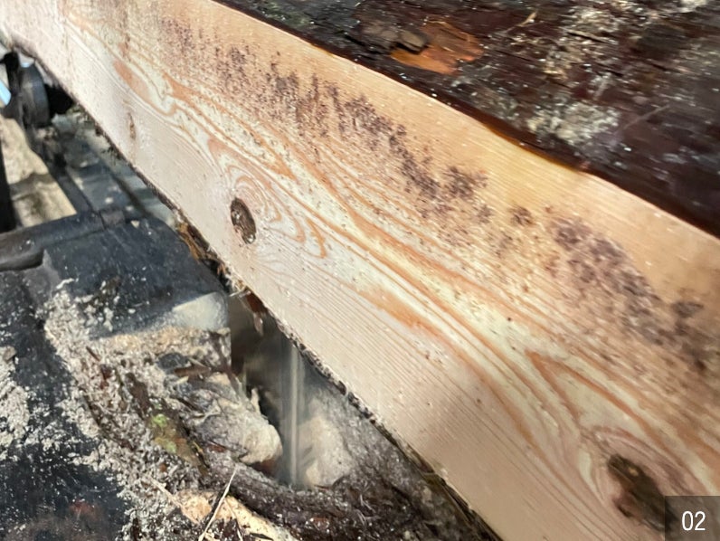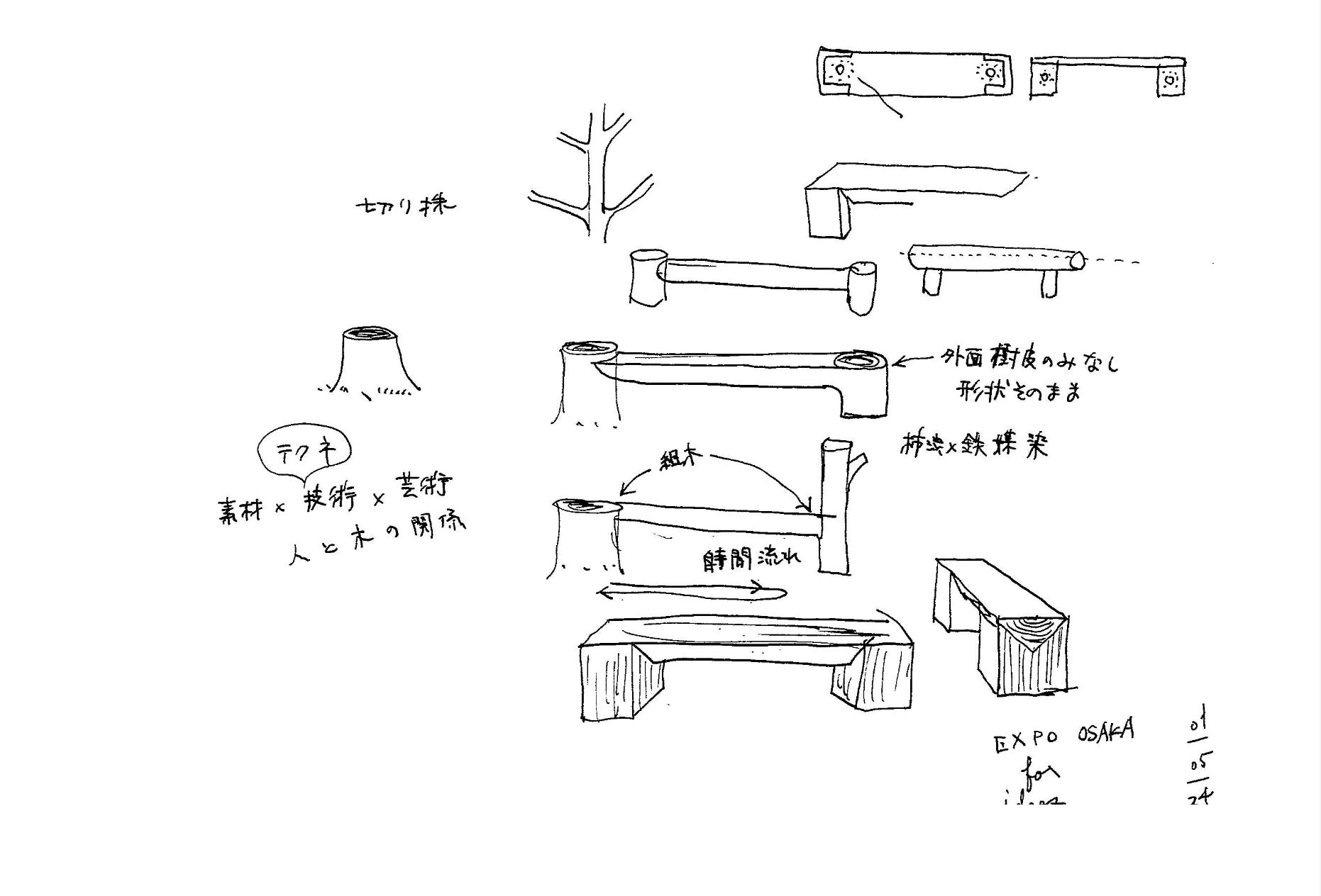 森で何十年と生きてきた樹は、切り倒された瞬間に「材料」になる。そのことを改めて感じることが命を大事にすることではないか ーとの想いで、時間とともに変化する樹の存在を肌で感じられるようあえて「材料」の形でベンチに。切り倒したばかりの樹は水分が多いので乾燥させてから使うのが一般的ですが、あえて乾燥工程を万博会場で行うチャレンジでもあります。